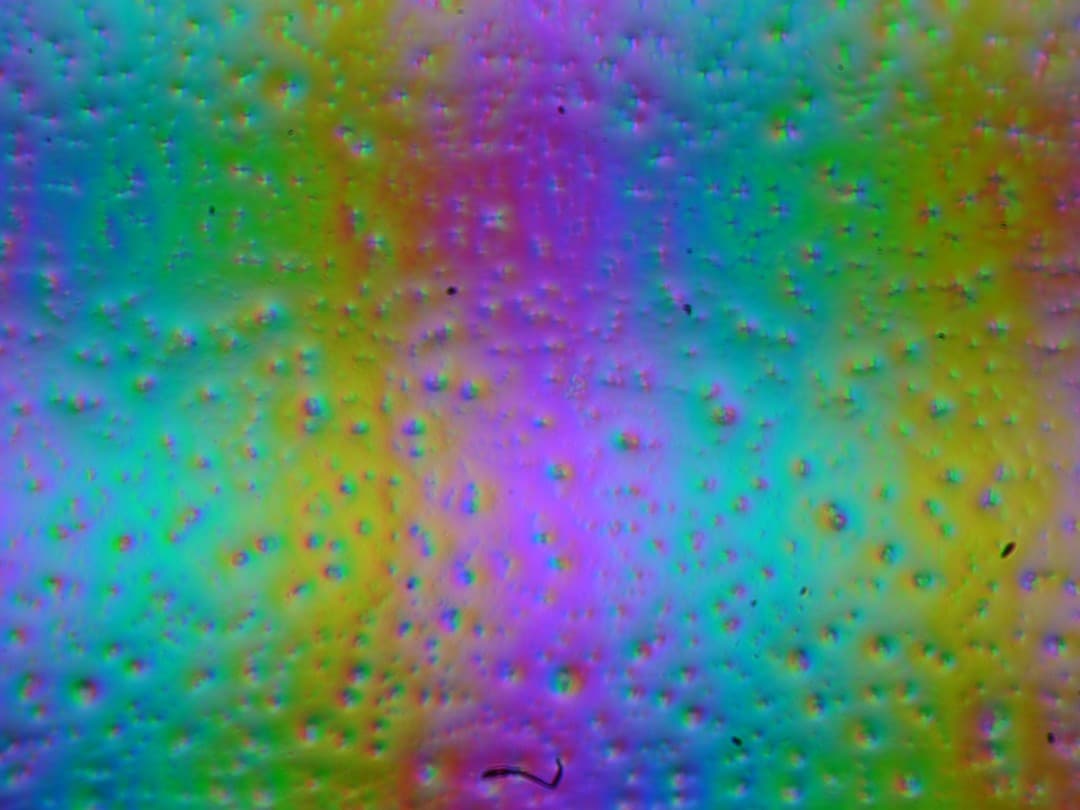 Зерно этих дефектов в несколько раз меньше размеров субпикселей (масштаб этих двух фотографий одинаковый), поэтому фокусировка на микродефектах и «перескок» фокуса по субпикселям при изменении угла зрения выражены слабо, из-за этого нет и «кристаллического» эффекта.