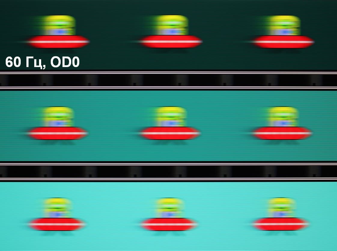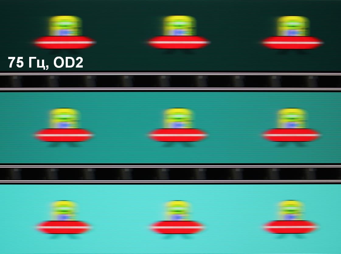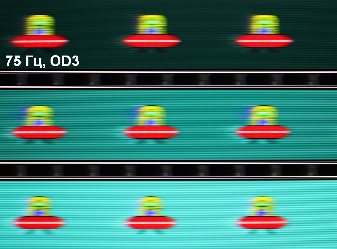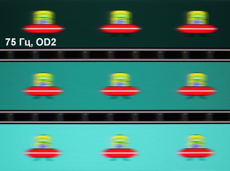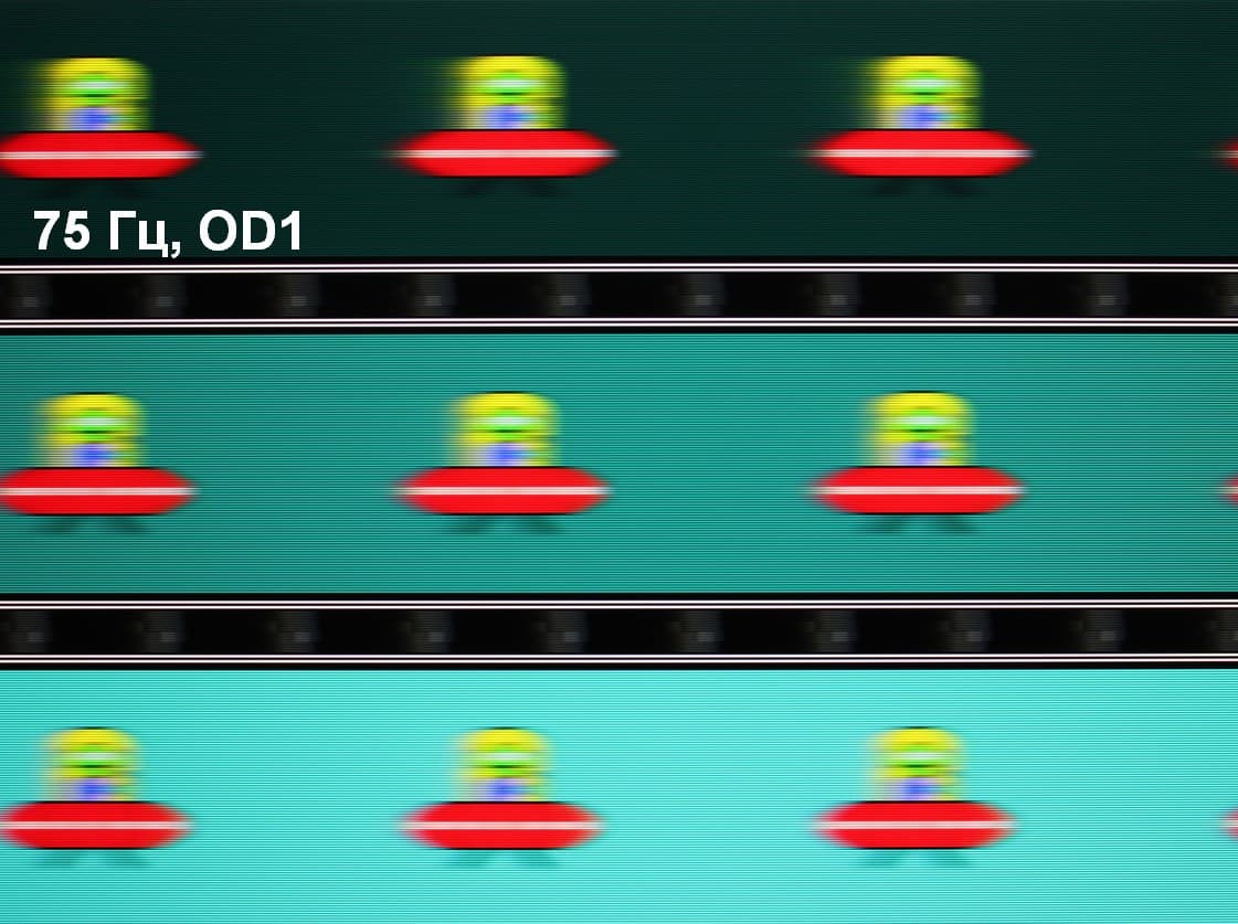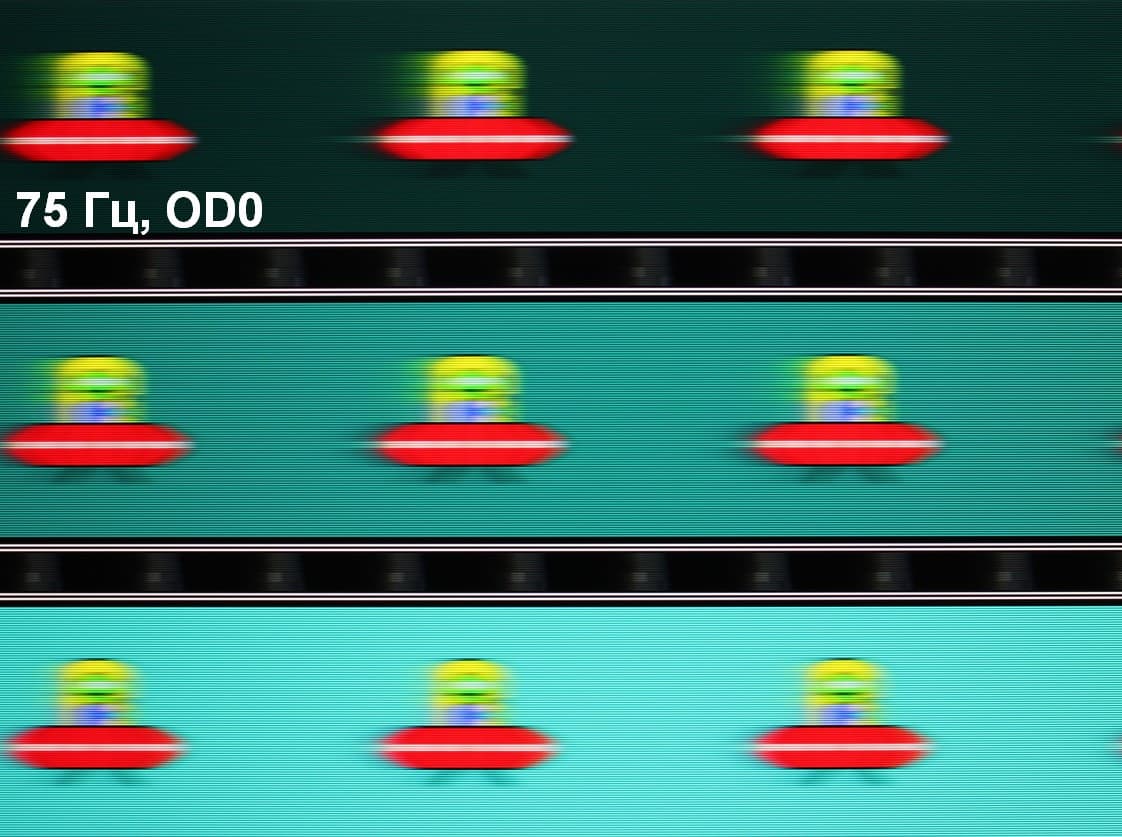 Для наглядного представления о том, что на практике означает такая скорость матрицы и какие могут быть артефакты от разгона, приведем серию снимков, полученных с помощью движущейся камеры. Такие снимки показывают, что видит человек, если он следит глазами за двигающимся на экране объектом. Описание теста приведено тут, страница с самим тестом тут. Использовались рекомендованные установки — скорость движения 960 пиксель/с для частоты 60 Гц, и 975 пиксель/с для 75 Гц. Выдержка 1/15 с, на фотографиях указаны значения частоты обновления, а также ступень разгона (OD с цифрой).