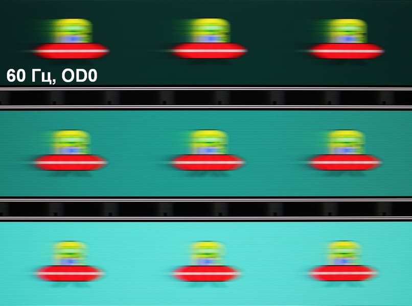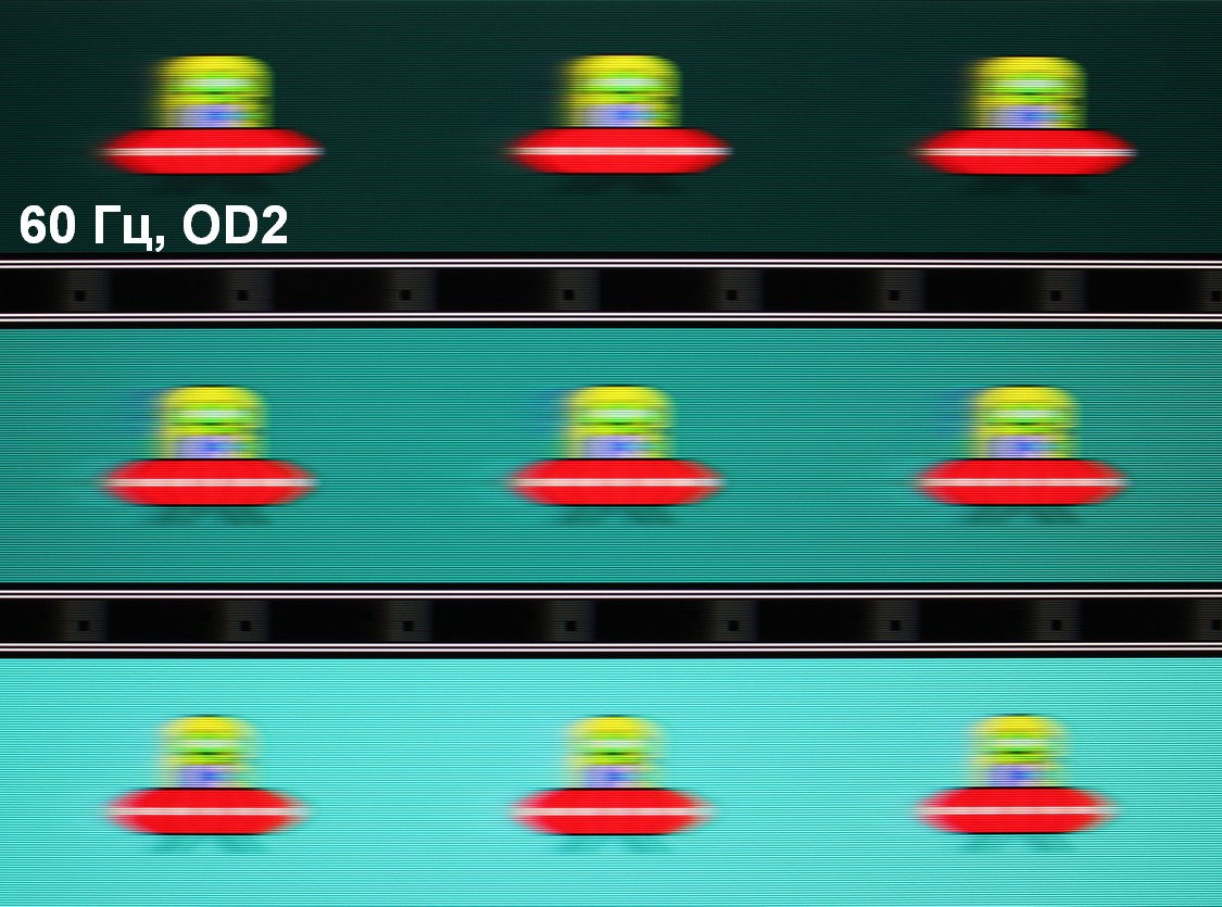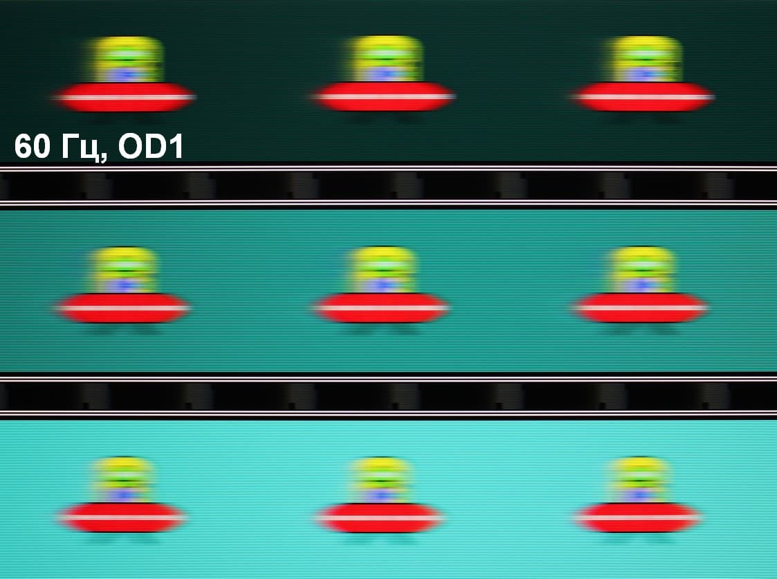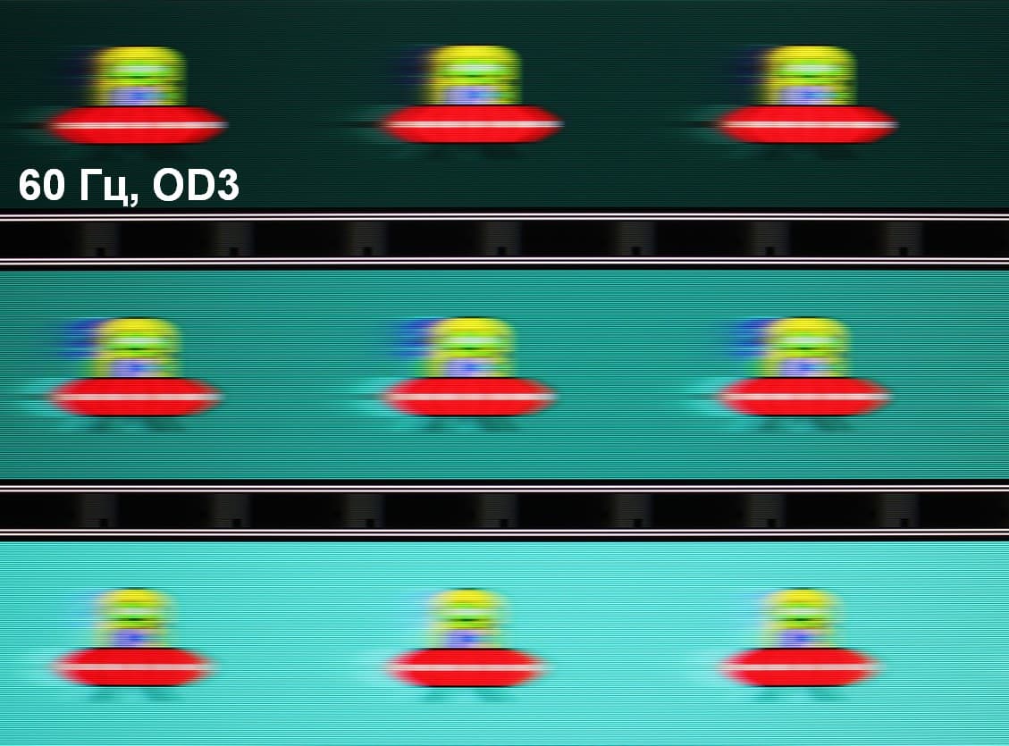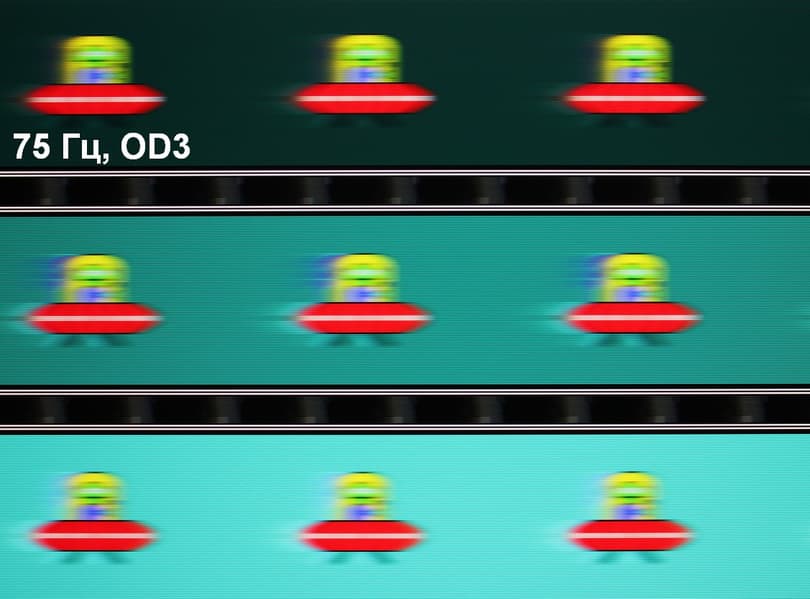Видно, что при прочих равных условиях четкость изображения повышается по мере роста частоты обновления (в данном случае незначительно) и степени разгона, но на максимальном разгоне артефакты (шлейф позади тарелки) уже очень заметные.