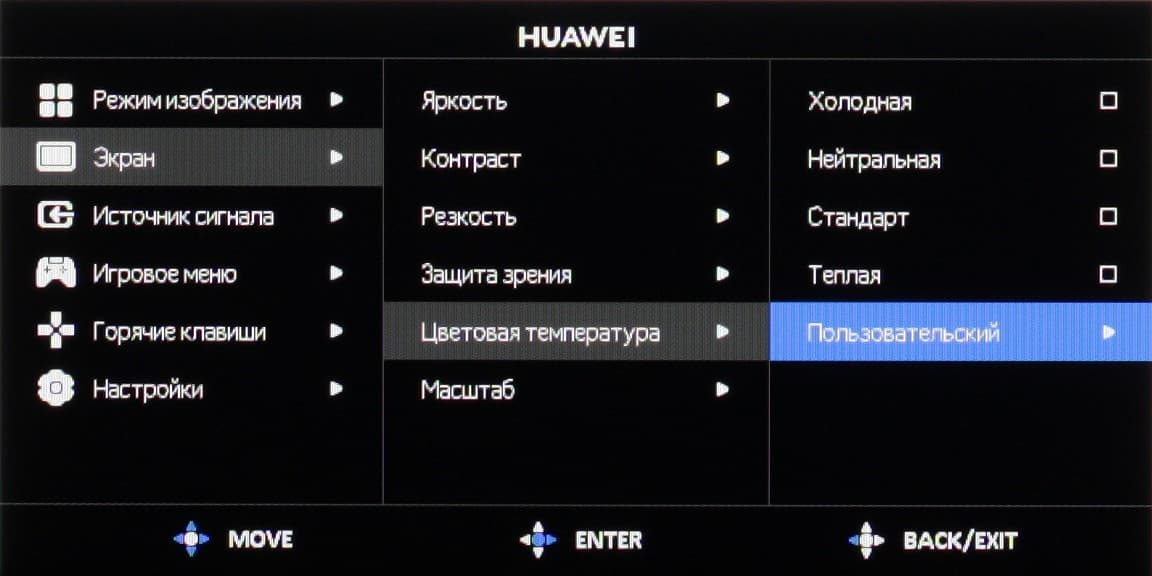 Можно корректировать цветовой баланс выбором цветового профиля из четырех предустановленных или пользовательского, в котором цветовой баланс можно подправить регулировками интенсивности трех основных цветов.