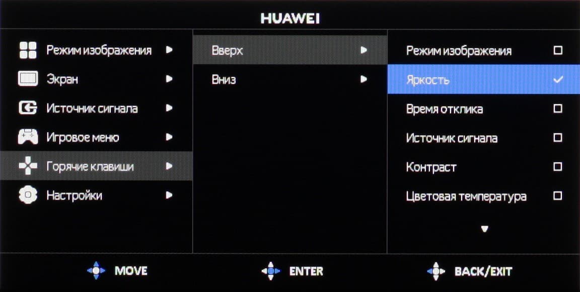 Навигация удобная, так как все делается только джойстиком, не нужно переносить палец на кнопки, к тому же списки зациклены. При настройке изображения меню остается на экране — это несколько мешает оценке вносимых изменений. Настраиваются уровень прозрачности фона и задержка автоматического выхода из меню.