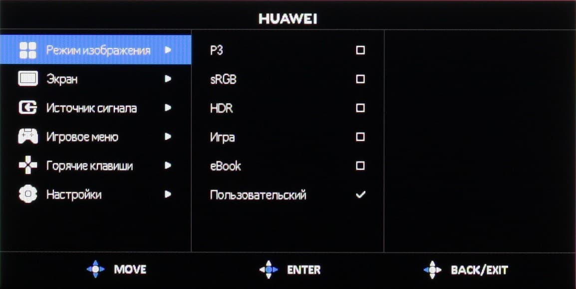 Есть и режим с динамической регулировкой яркости подсветки (Режим Эко). Можно выбрать один из пяти предустановленных профилей, в которых может меняться гамма-кривая и/или цветовой охват или пользовательский профиль, который по сути равнозначен первому, который P3.