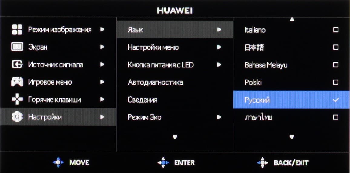 Есть русская версия экранного меню. Кириллический шрифт меню достаточно ровный и читаемый, качество перевода на русский язык хорошее.