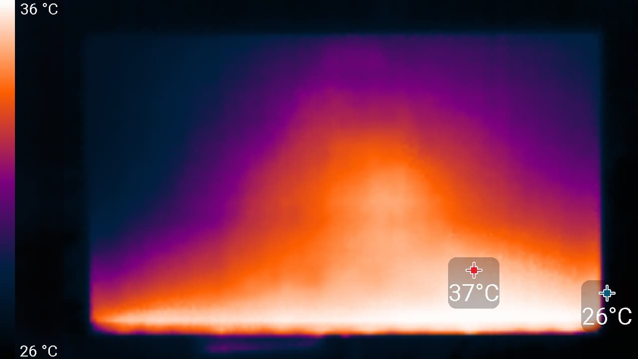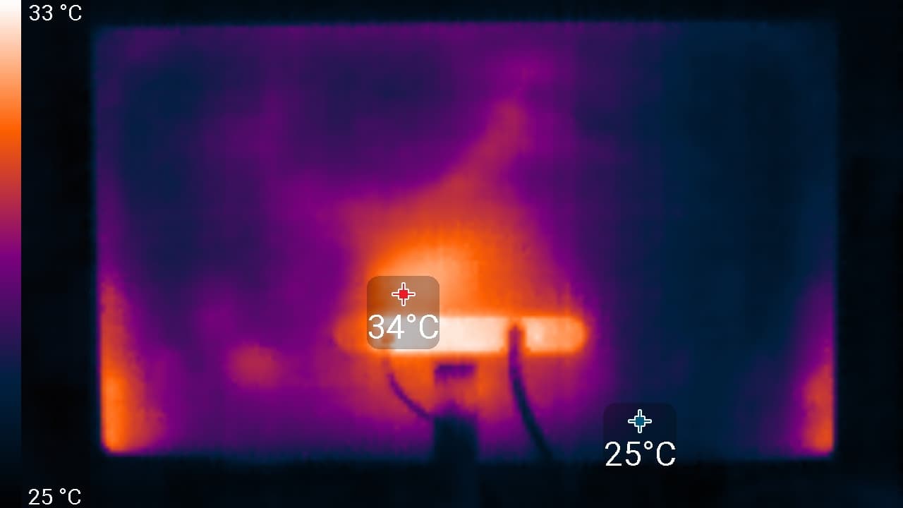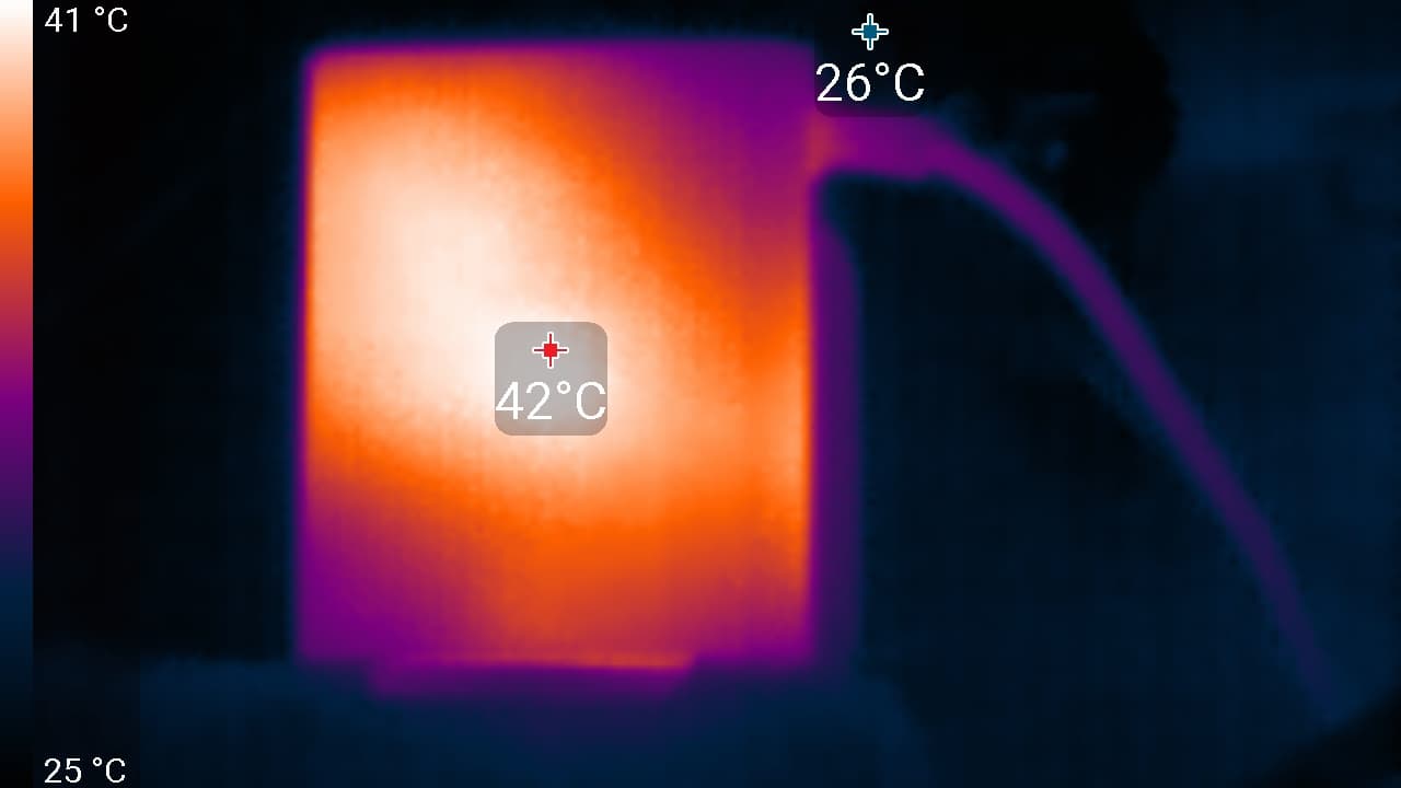 Нагрев умеренный. Повышенный нагрев нижнего края экрана показывает, что внизу находится светодиодная линейка подсветки экрана. Корпус адаптера питания нагрелся до 42 °C, что немного: