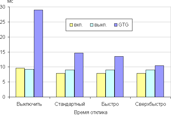 Время отклика зависит от значения одноименной настройки, которая управляет разгоном матрицы. Ступеней регулировки четыре. Диаграмма ниже показывает, как меняется время включения и выключения при переходе черный-белый-черный (столбики «вкл.» и «выкл.»), а также среднее суммарное время для переходов между полутонами (столбики GTG):