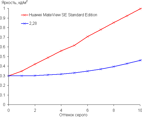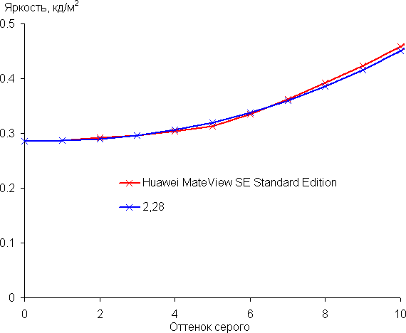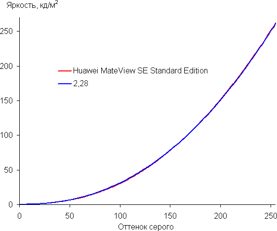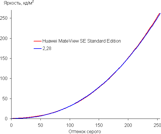 Аппроксимация полученной гамма-кривой в случае профилей P3 и sRGB дала показатель 2,28, что немного выше стандартного значения 2,2. При этом реальная гамма-кривая мало отклоняется от аппроксимирующей степенной функции: