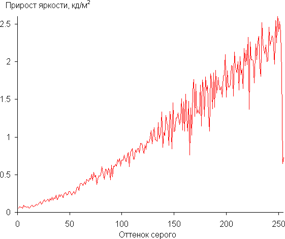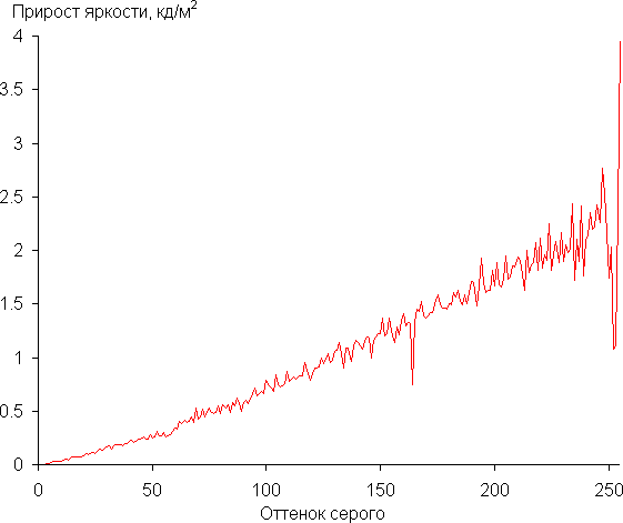 В случае sRGB рост яркости самых темных оттенков близок линейному, что отвечает стандарту sRGB, и приводит к хорошей различимости между оттенками: