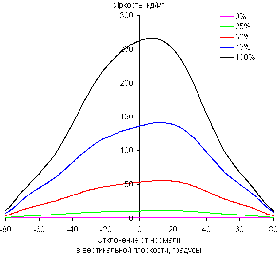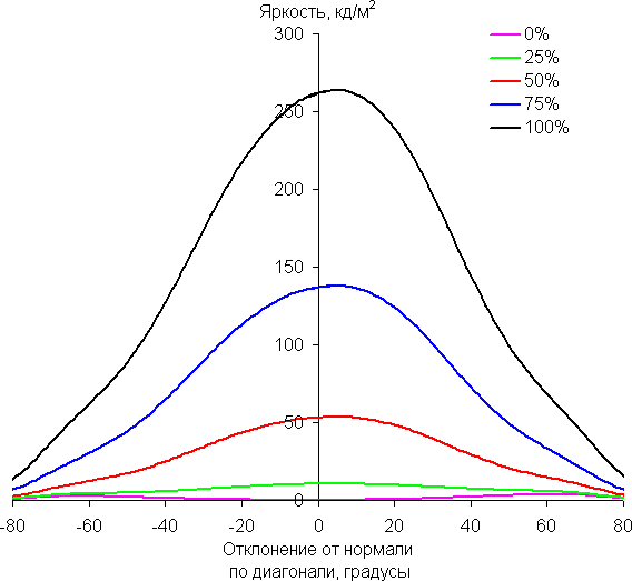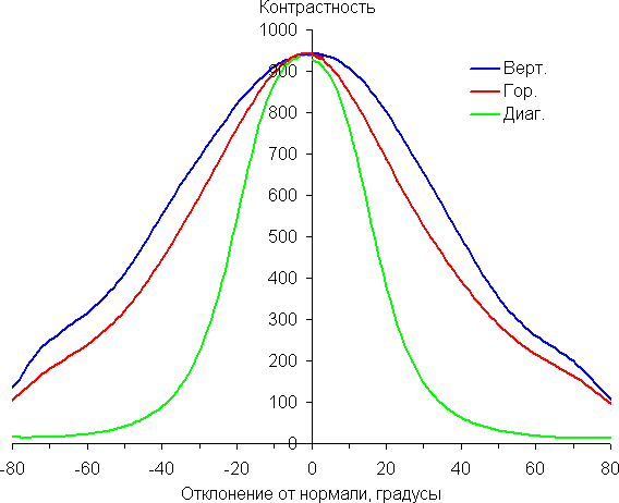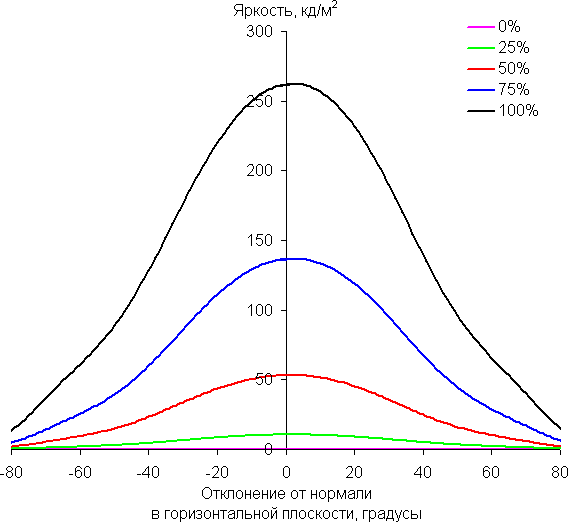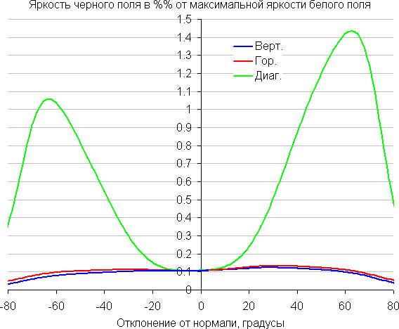 По скорости снижения яркости углы обзора довольно широкие, что для матрицы типа IPS характерно. При отклонении в диагональном направлении яркость черного поля начинает резко возрастать уже при 20°-30° отклонения от перпендикуляра к экрану. Если сидеть не очень далеко от экрана, то черное поле по углам будет заметно светлее, чем в центре (оставаясь условно нейтрально-серым). Контрастность в диапазоне углов ±82° в случае отклонения по диагонали приближается к отметке 10:1, но не опускается ниже.