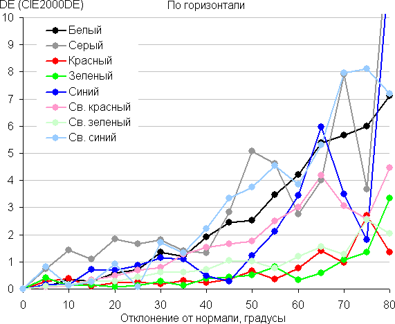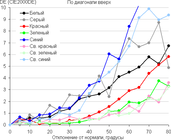 Для количественной характеристики изменения цветопередачи мы провели колориметрические измерения для белого, серого (127, 127, 127), красного, зеленого и синего, а также светло-красного, светло-зеленого и светло-синего полей во весь экран с использованием установки, подобной той, что применялась в предыдущем тесте. Измерения проводились в диапазоне углов от 0° (датчик направлен перпендикулярно к экрану) до 80° с шагом в 5°. Полученные значения интенсивностей были пересчитаны в ΔE относительно замера каждого поля при перпендикулярном положении датчика относительно экрана. Результаты представлены ниже: