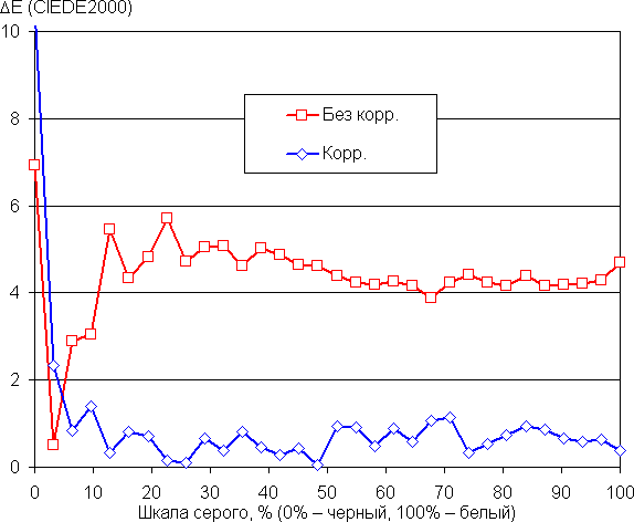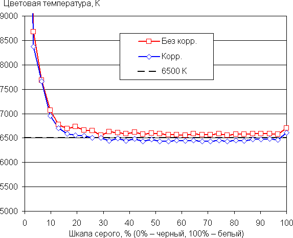 Цветовой баланс во всех встроенных профилях (кроме eBook естественно) достаточно хороший (если для настройки Цветовая температура выбран вариант Стандарт — так по умолчанию), так как цветовая температура достаточно близка к стандартным 6500 К, и отклонение от спектра абсолютно черного тела (параметр ΔE) гораздо меньше 10 единиц, что для потребительского устройства считается очень хорошим показателем. При этом оба параметра мало изменяются на различных участках шкалы серого, что улучшает визуальное восприятие цветового баланса. Но все равно мы попытались улучшить цветовой баланс, регулируя усиление трех основных цветов. Графики ниже показывают цветовую температуру на различных участках шкалы серого и отклонение от спектра абсолютно черного тела (параметр ΔE) в случае отсутствия вмешательства и после ручной коррекции (R = 100, G = 96, B = 98; в обоих случаях выбран профиль sRGB):