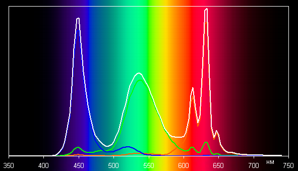 Спектры основных цветов очень хорошо разделены, что и обуславливает широкий цветовой охват. Небольшое перекрестное подмешивание вызвано, видимо, неидеальным разделением с помощью светофильтров. Можно предположить, что в светодиодах подсветки применяется синий излучатель и зеленый и красный люминофоры, при этом в люминофорах, по всей видимости, используются так называемые квантовые точки. В случае профиля sRGB с корректировкой цветового охвата компоненты уже подмешиваются друг к другу в значительной степени: