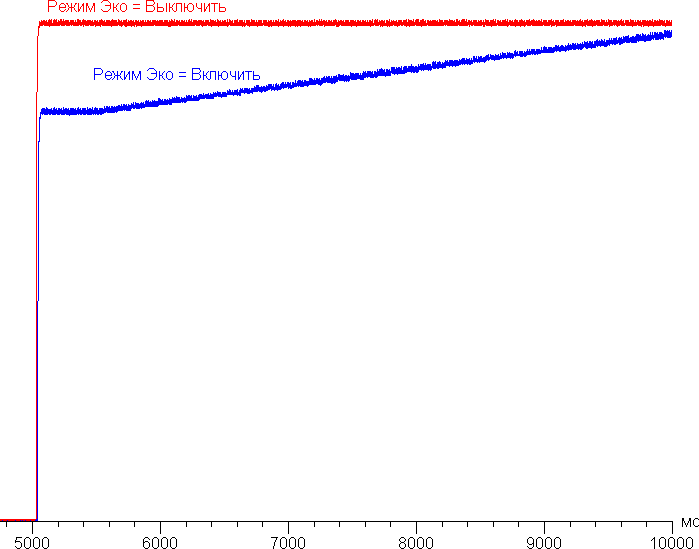 При включении режима с динамическим управлением яркости установившаяся междукадровая контрастность формально возрастает, но не до бесконечности, так как даже на черном поле во весь экран подсветка совсем не выключается. График ниже показывает, как увеличивается яркость (вертикальная ось) при переключении с черного поля во весь экран (после 5 секунд выдержки) на белое поле во весь экран при выключенной и включенной динамической подстройке яркости: