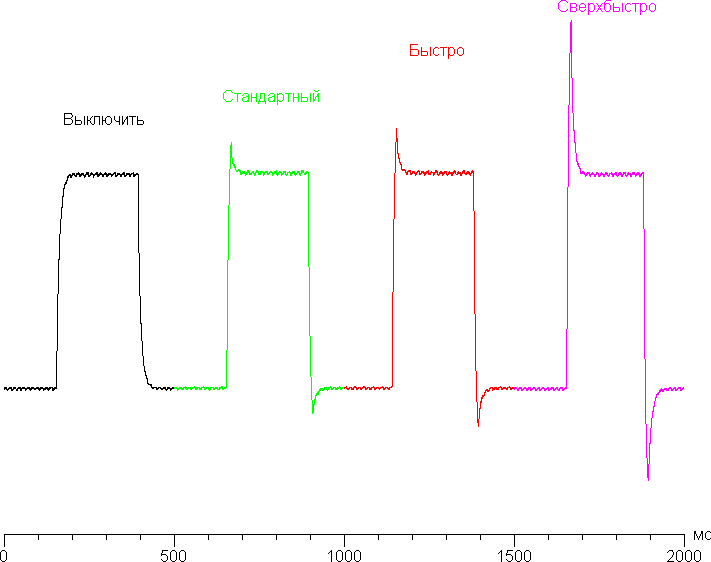 Ниже приведены графики полутонового перехода между оттенками 40% и 60% и обратно при различных значениях настройки Время отклика (по вертикали — яркость, по горизонтали — время, для наглядности графики выстроены последовательно):