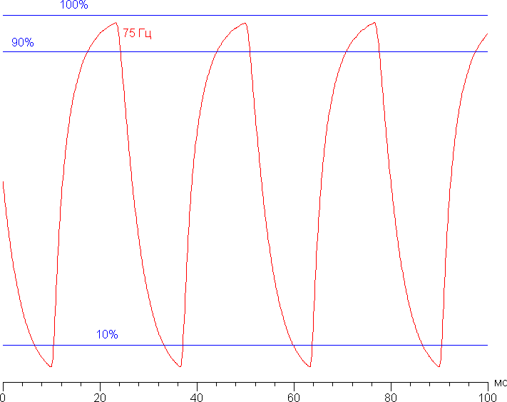 Приведем зависимость яркости (вертикальная ось) от времени (горизонтальная ось) при чередовании белого и черного кадра при 75 Гц кадровой частоты: