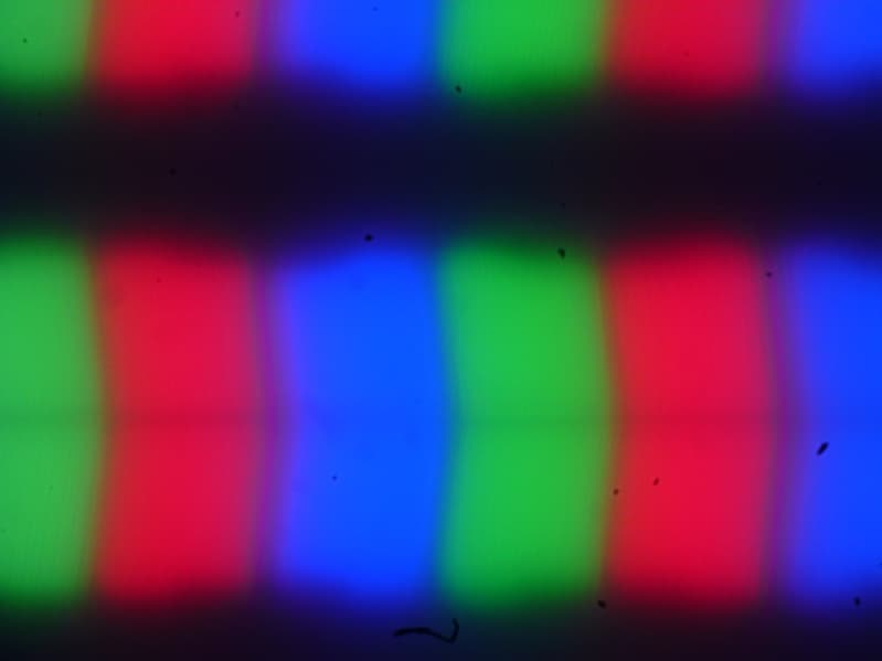 Из-за матовой поверхности экрана четкого изображения пикселей получить не удалось (черные точки — это пыль на матрице фотоаппарата), однако характерная для IPS структура субпикселей просматривается: