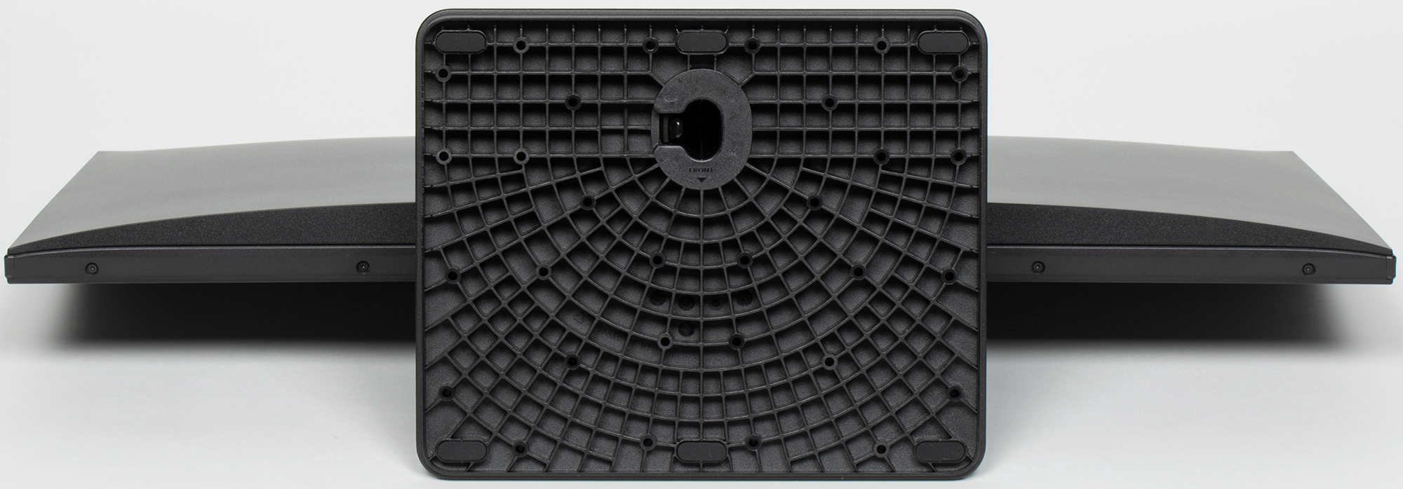 Основание подставки относительно большое по площади, но оно сверху лишь слегка выпуклое и почти горизонтальное, что повышает эффективность использования рабочей площади стола. Например, сверху на основание можно класть всякую офисную мелочевку или поместить край клавиатуры.