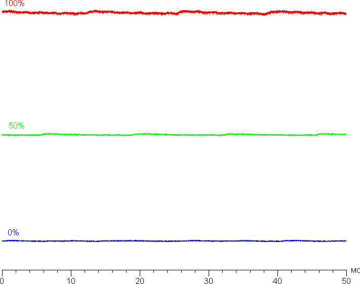 На любом уровне яркости значимая модуляция подсветки отсутствует, что исключает видимое мерцание экрана. Для тех, кто привык распознавать знакомое сокращение, уточним: ШИМ отсутствует. В доказательство приведем графики зависимости яркости (вертикальная ось) от времени (горизонтальная ось) при различных значениях настройки яркости: