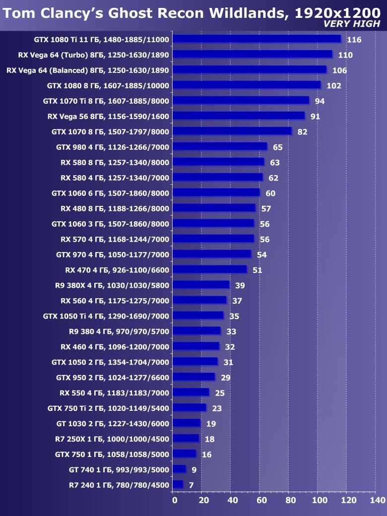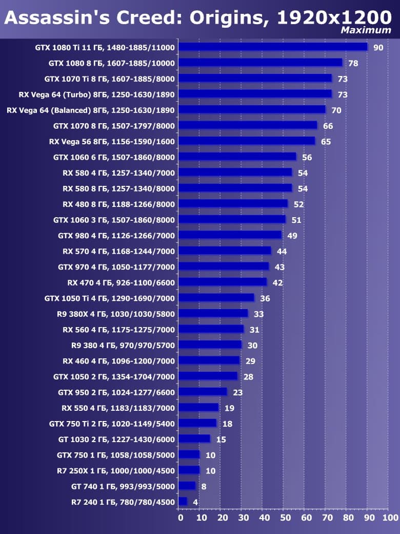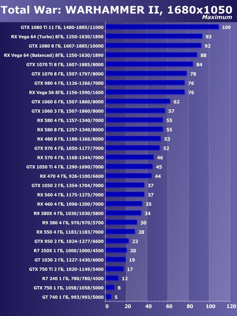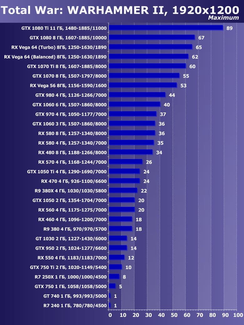 | 21 | RX 460 4 ГБ, 1096—1200/7000 | 720 | 828 | 8700 |