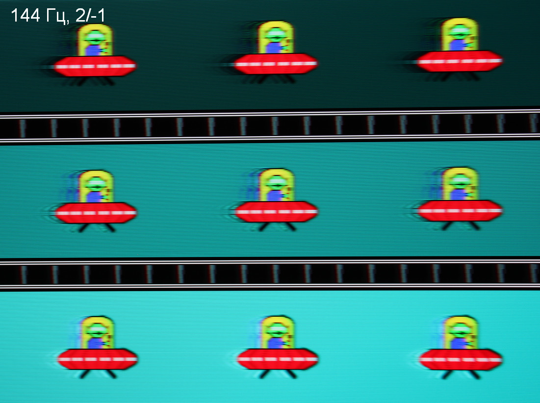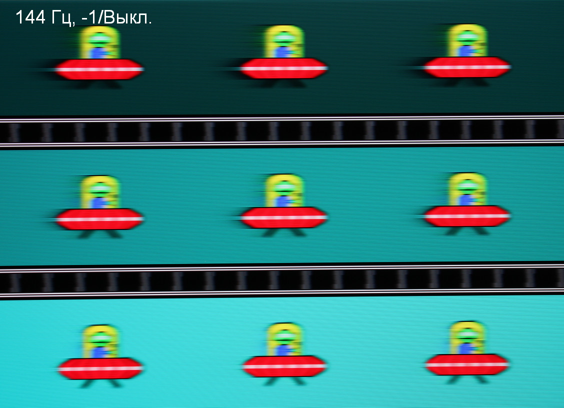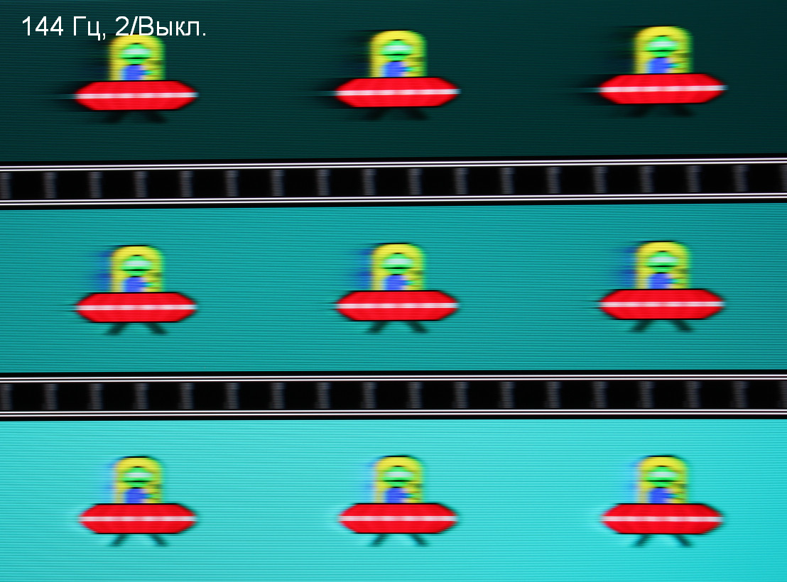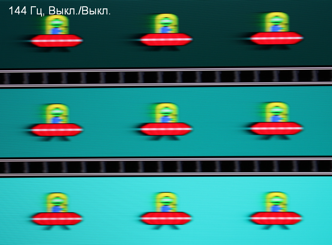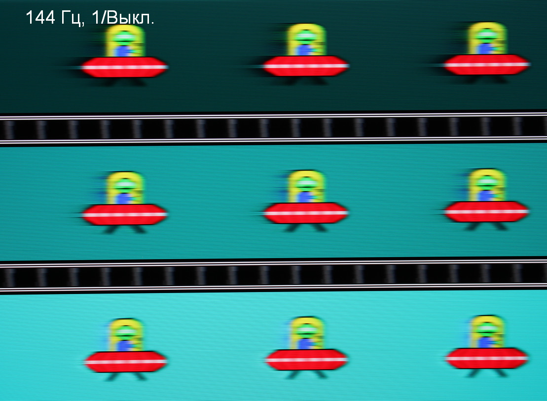 Для наглядного представления о том, что на практике означает такая скорость матрицы, какие могут быть артефакты от разгона и повышает ли четкость в движении, описанная выше настройка MBR, приведем серию снимков, полученных с помощью движущейся камеры. Такие снимки показывают, что видит человек, если он следит глазами за двигающимся на экране объектом. Описание теста приведено тут, страница с самим тестом тут. Отметим, что получить хорошие по качеству снимки в этом тесте в случае изогнутого монитора сложно. Использовались рекомендованные установки (скорость движения 960 пиксель/с), выдержка 1/15 с, на фотографиях указаны значения частоты обновления, а также настроек Overdrive / MBR. Отметим, что при включении MBR безальтернативно выбирается максимальный разгон.