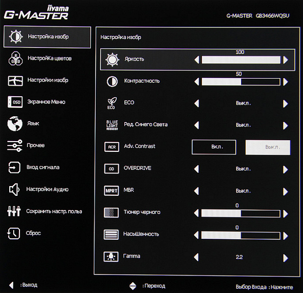 Настроек, влияющих на яркостный и цветовой баланс, не очень много, что для игрового монитора ожидаемо. Есть регулировки яркости (подсветки) и контрастности, функции принудительного снижения яркости и интенсивности синей компоненты, динамической подстройки яркости, разгона матрицы, вставки черного кадра, регулировки насыщенности и гамма-кривой.