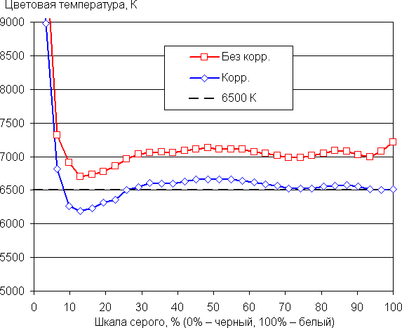 Самый близкий к черному диапазон можно не учитывать, так как в нем цветопередача не так важна, а погрешность измерения цветовых характеристик высокая. Ручная коррекция приблизила цветовую температуру к 6500 К, а заодно и уменьшила значение ΔE, правда довольно большой разброс этого параметра сохранился, что несколько ухудшает визуальное восприятие цветового баланса. Впрочем, для игрового применения это не принципиально, да и в коррекции необходимости нет.
