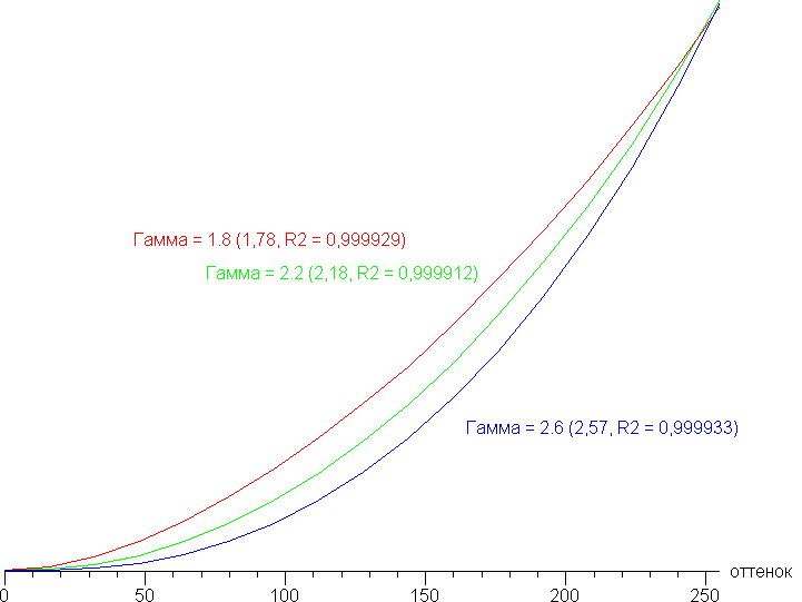Реальная гамма-кривая зависит от выбранного профиля в списке Гамма (значения показателей аппроксимирующей функции приведены в скобках в подписях, там же — коэффициент детерминации):