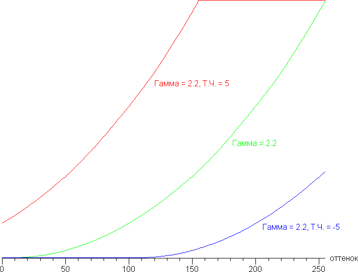 Дополнительной настройкой Тюнер черного (Т. Ч.) можно скорректировать гамма-кривую, улучшая различимость деталей в тенях. Это может быть полезно в играх с темными сценами. Ниже приведены гамма-кривые при крайних значениях Т. Ч.: