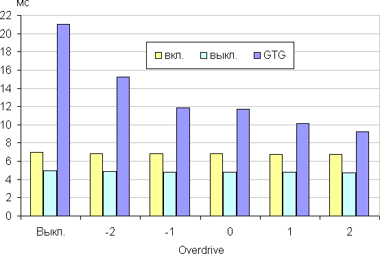 Время отклика зависит от значения настройки Overdrive, которая управляет разгоном матрицы. График ниже показывает, как меняется время включения и выключения при переходе черный-белый-черный (столбики «вкл.» и «выкл.»), а также среднее суммарное время для переходов между полутонами (столбики «GTG») для шести значений этой настройки: