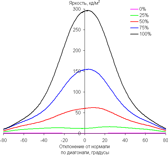 Из графиков следует, что при взгляде под углом хотя бы основные цвета меняются несильно, но полутона (особенно светло-синий) существенно изменяются, что ожидаемо для матрицы типа *VA и является ее основным недостатком.
