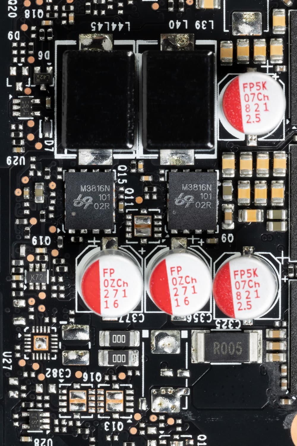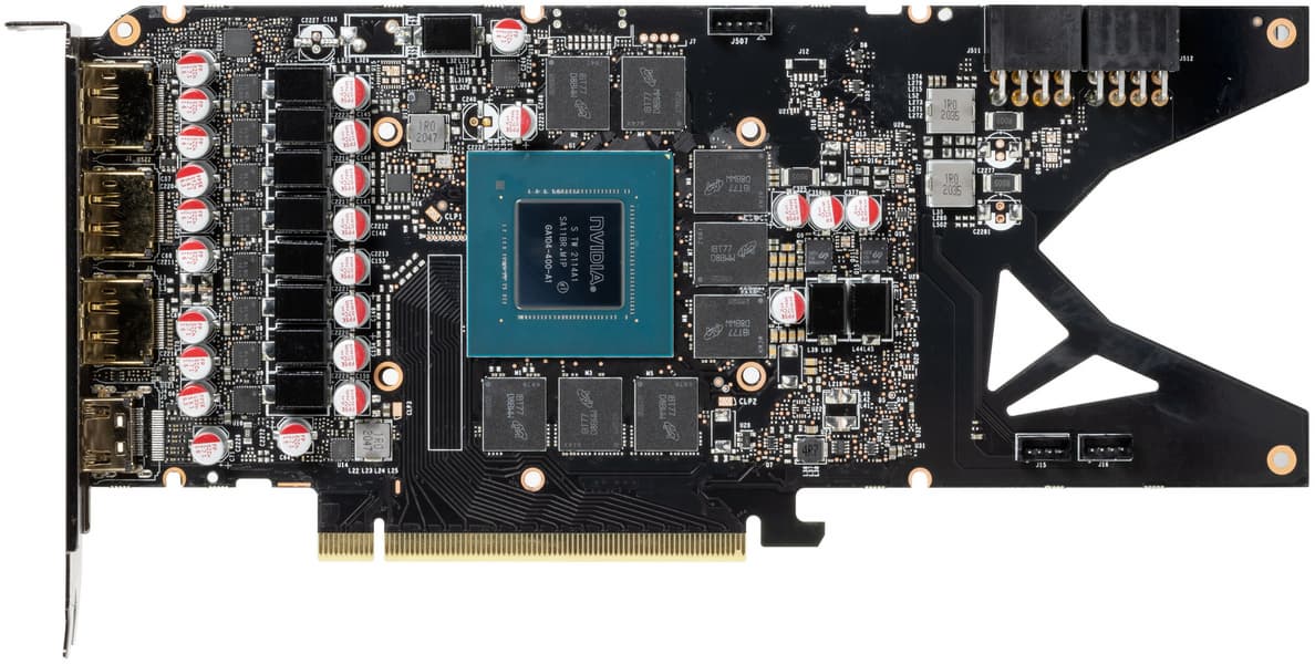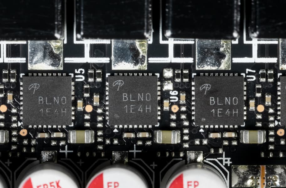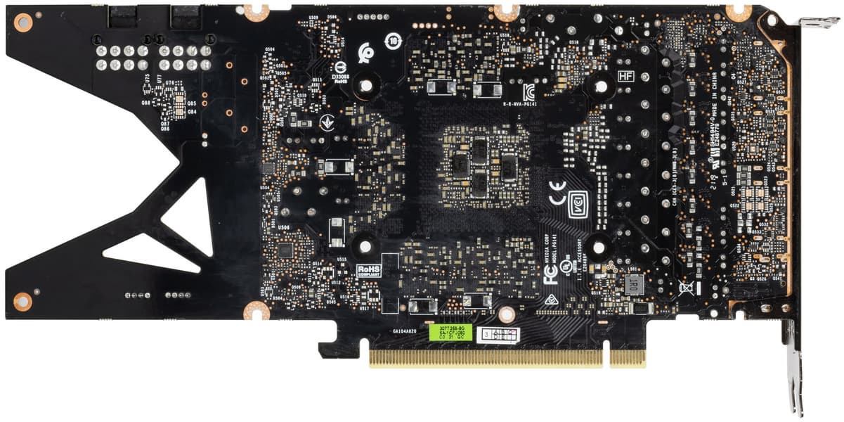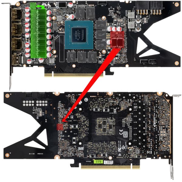 В преобразователе питания GPU, традиционно для всех видеокарт Nvidia, используются транзисторные сборки DrMOS — в данном случае AOZ5332QI (Alpha & Omega Semiconductor), каждая из которых рассчитана максимально на 50 А.
