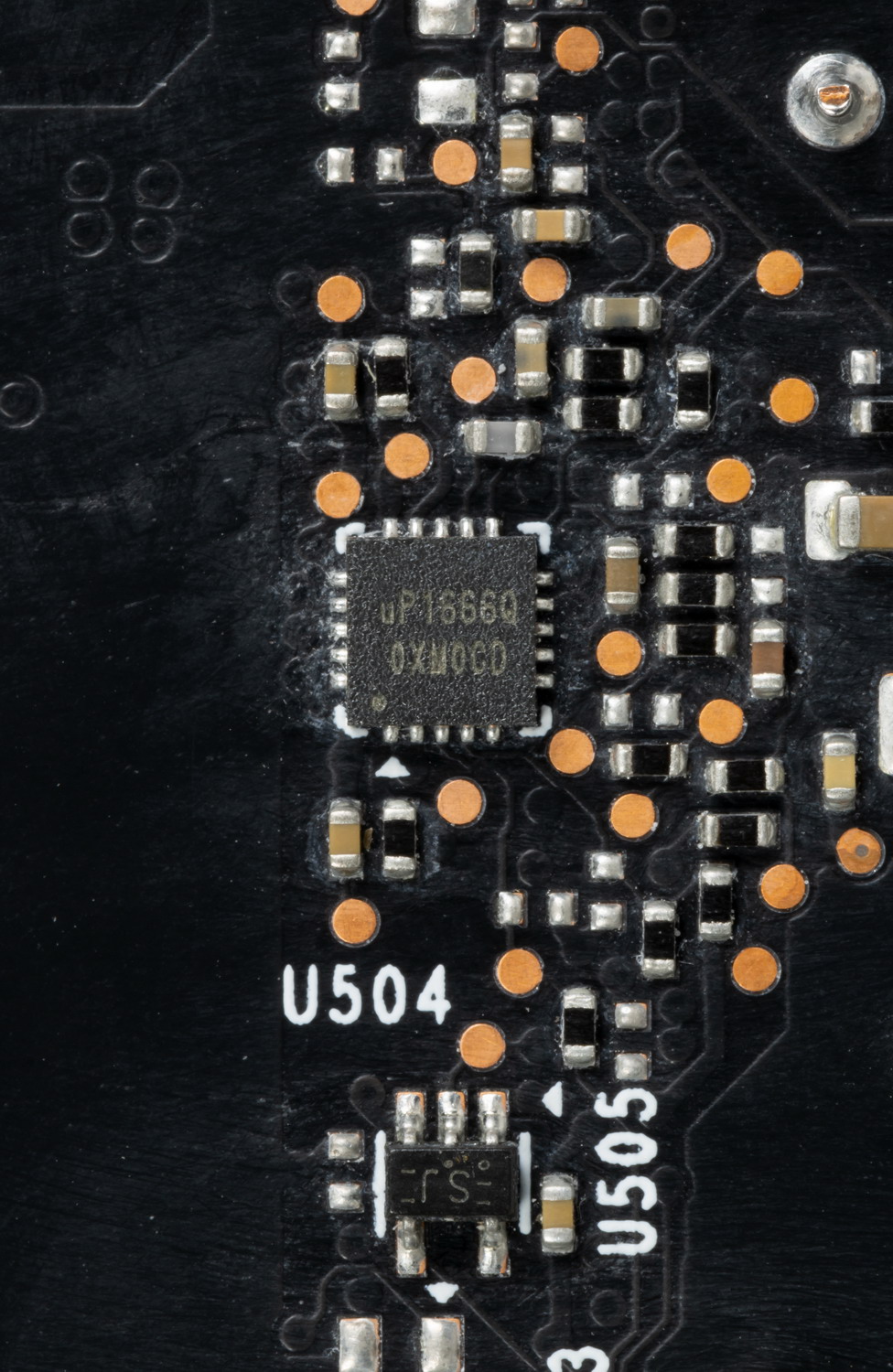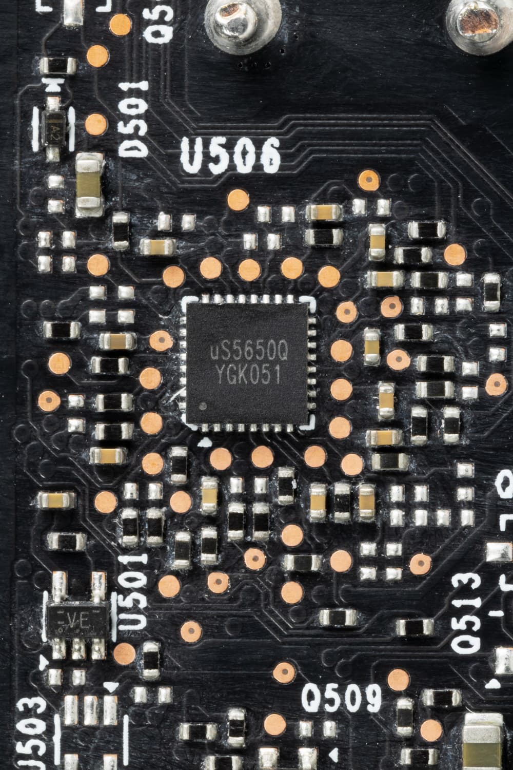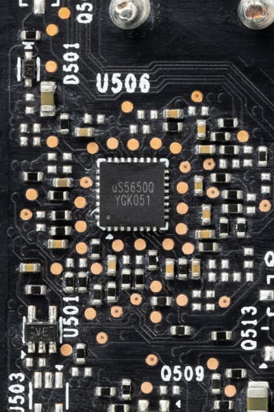Также на обратной стороне можно заметить контроллер uS5650Q (uPI Semiconductor), который отвечает за мониторинг карты (отслеживание напряжений и температуры).
