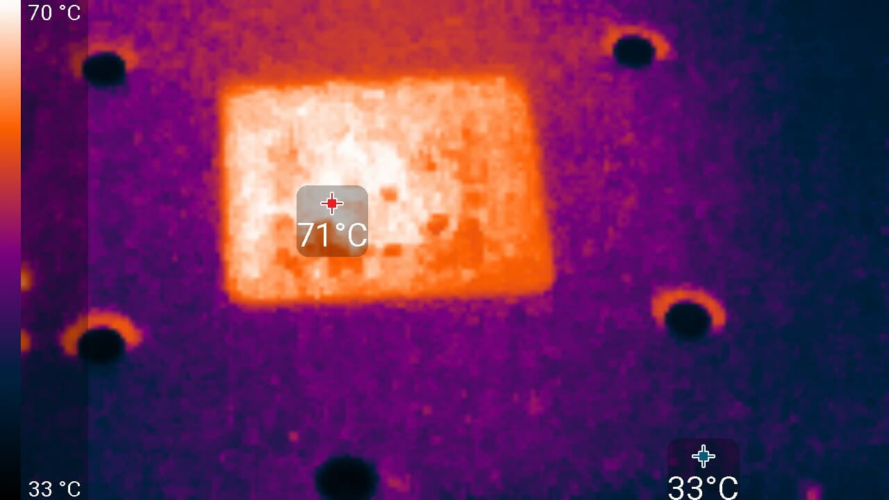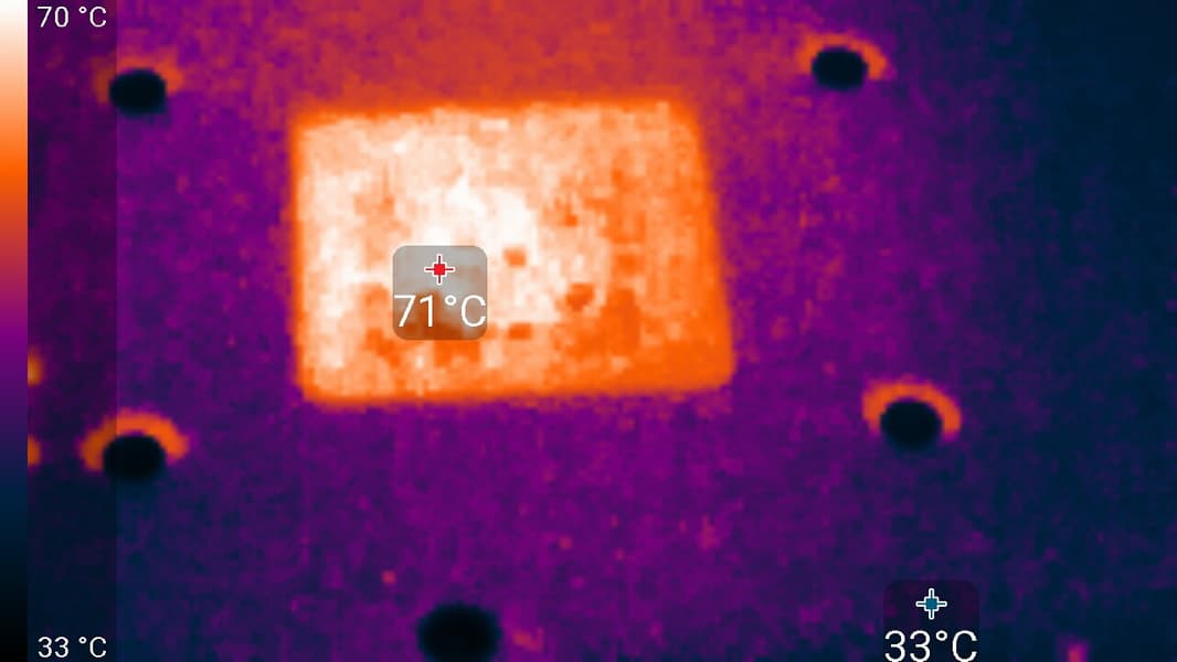 Максимальный нагрев наблюдался в центральной части PCB, в основном около ядра.