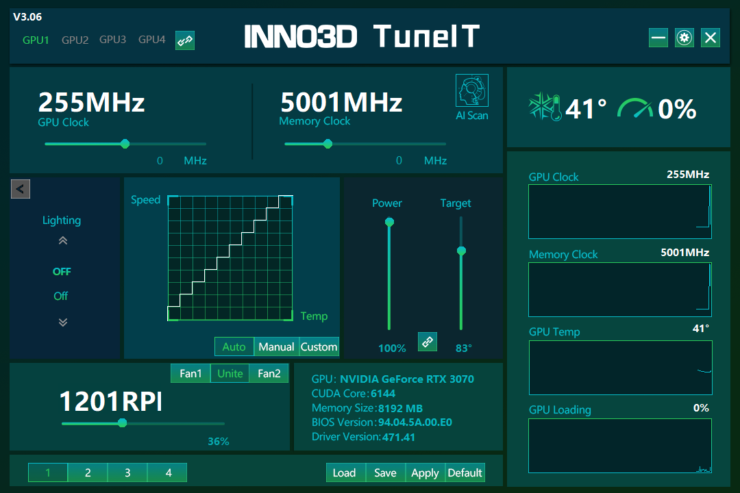 Управление работой карты обеспечивается с помощью фирменной утилиты Inno3D TuneIT. Впрочем, учитывая, что разгонять карту практически бессмысленно, а подсветки у нее нет, необходимость использовать эту программу не очевидна. К тому же последняя версия программы не распознает GeForce RTX 3070 Ti (выводит «GeForce RTX 3070»).