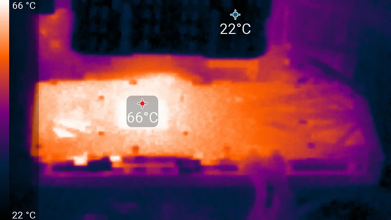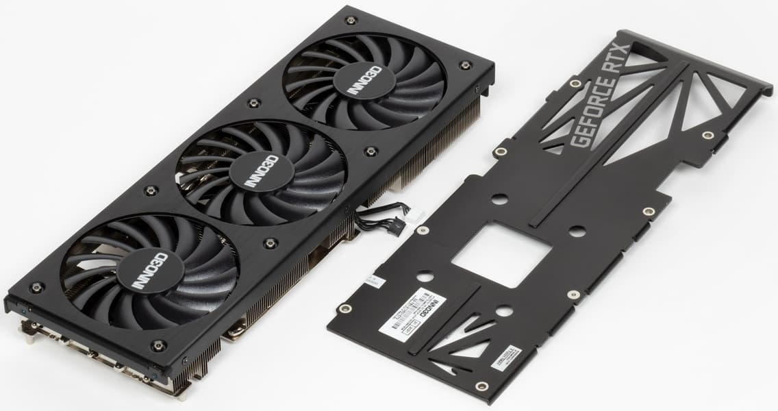 Систему охлаждения нельзя назвать тихой (ее слышно отчетливо, даже громко), но для двухслотового решения шум можно назвать приемлемым — вспомним хотя бы, как шумела референс-карта Nvidia. Однако нагрев компонентов все равно высокий, карта Inno3D может потреблять до 300 Вт. Потребуется хорошо вентилируемый корпус, потому что почти весь нагретый воздух видеокарта оставляет внутри системного блока.