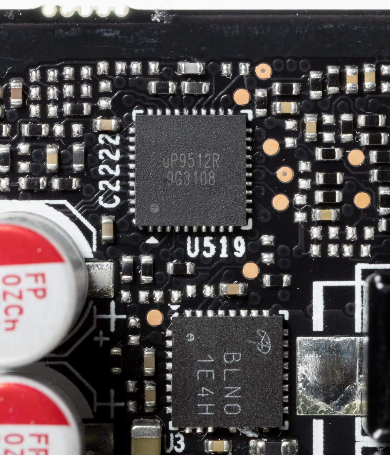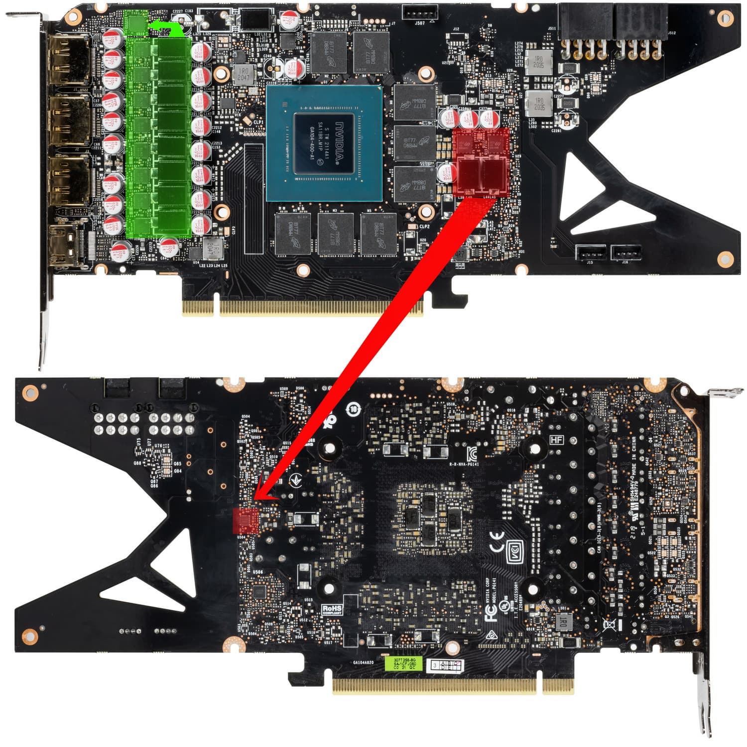 Зеленым цветом отмечена схема питания ядра, красным — памяти. Для управления схемой питания GPU используется ШИМ-контроллер uP9512R (uPI Semiconductor), расположенный на лицевой стороне платы.