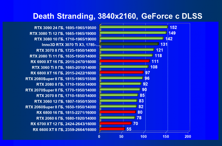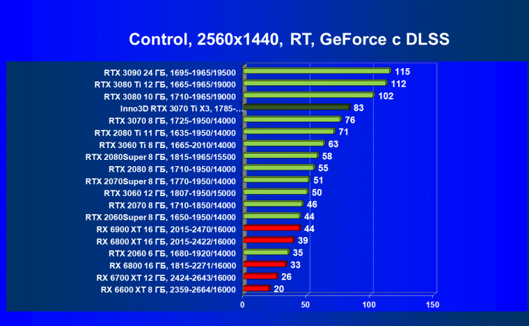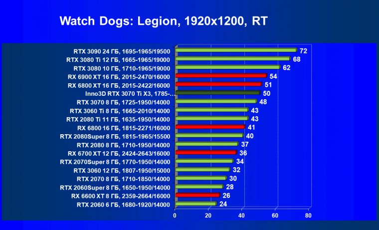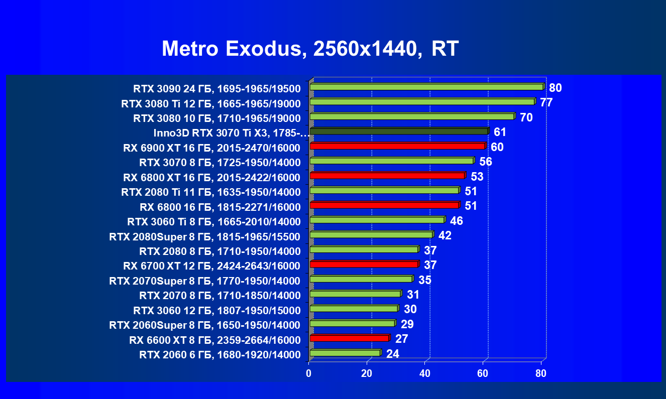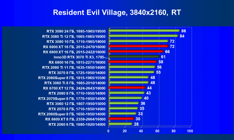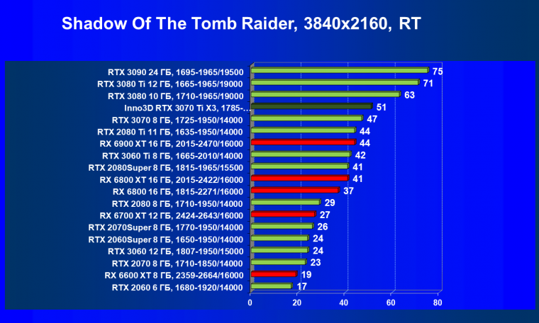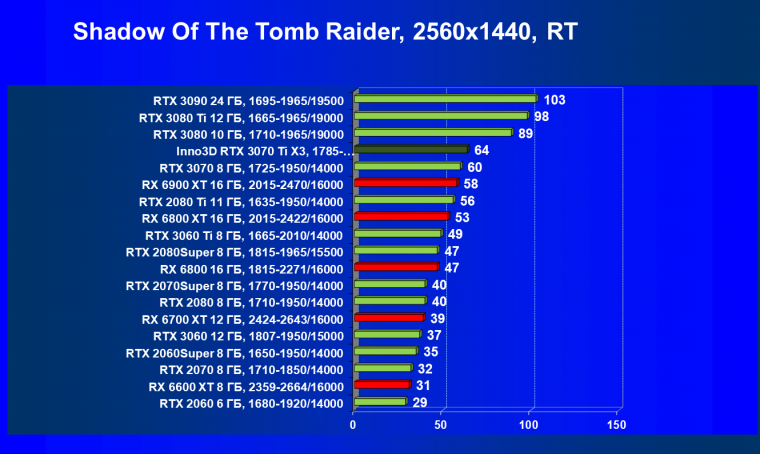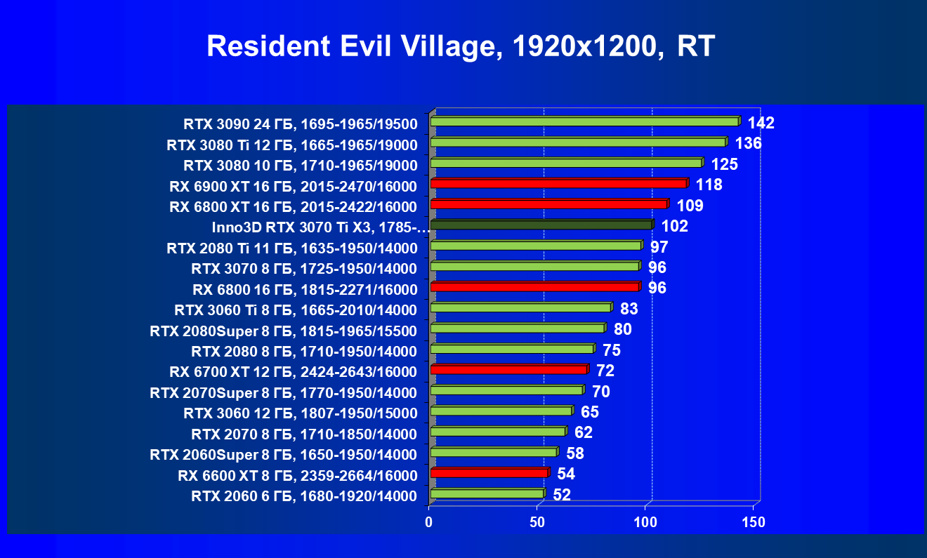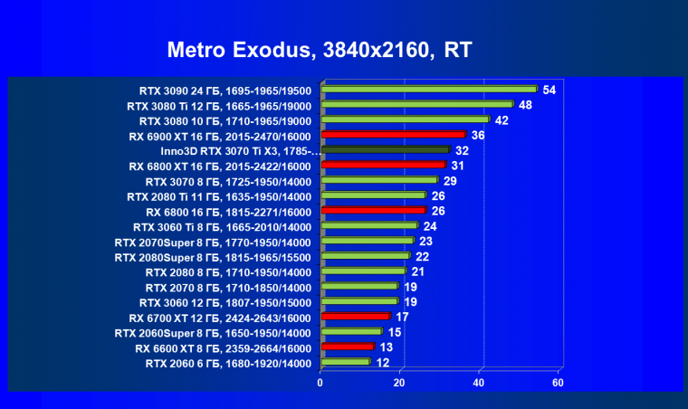 Из-за сильного падения производительности в играх с трассировкой лучей все семейство Radeon RX 6000 оказалось в аутсайдерах, так что GeForce RTX 3070 Ti лидирует в группе. И тогда именно GeForce RTX 3070 Ti может стать более выгодным приобретением для геймеров, чем GeForce RTX 3070 (без LHR тот явно будет дороже, чем указано в таблице).