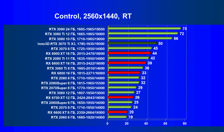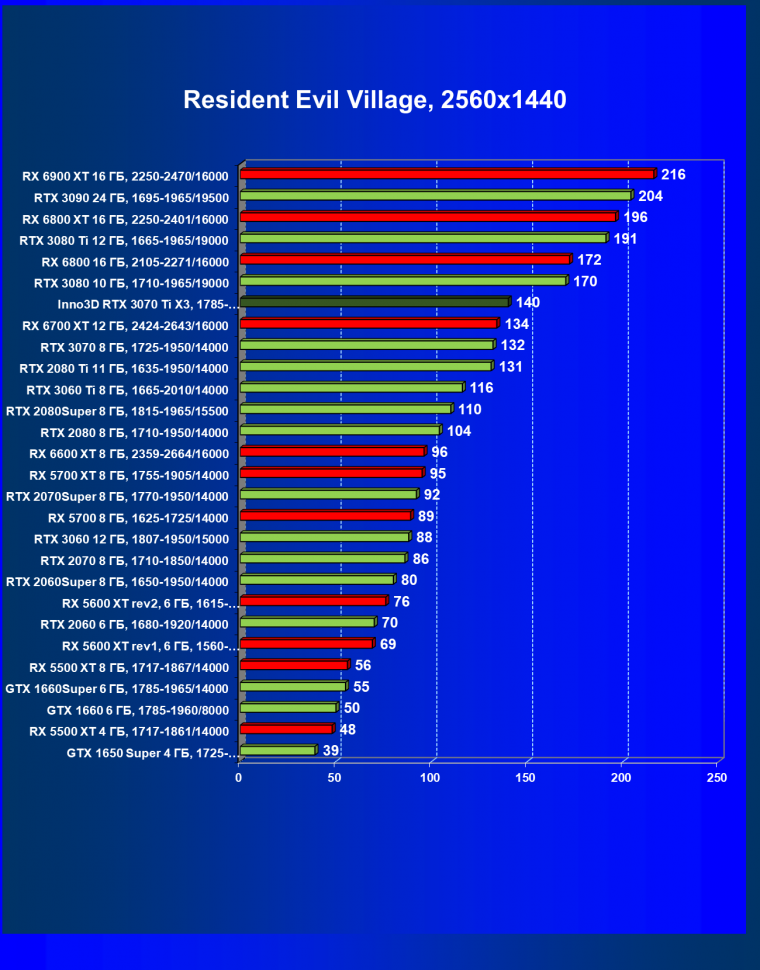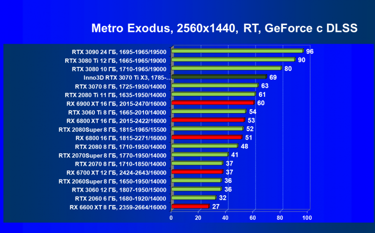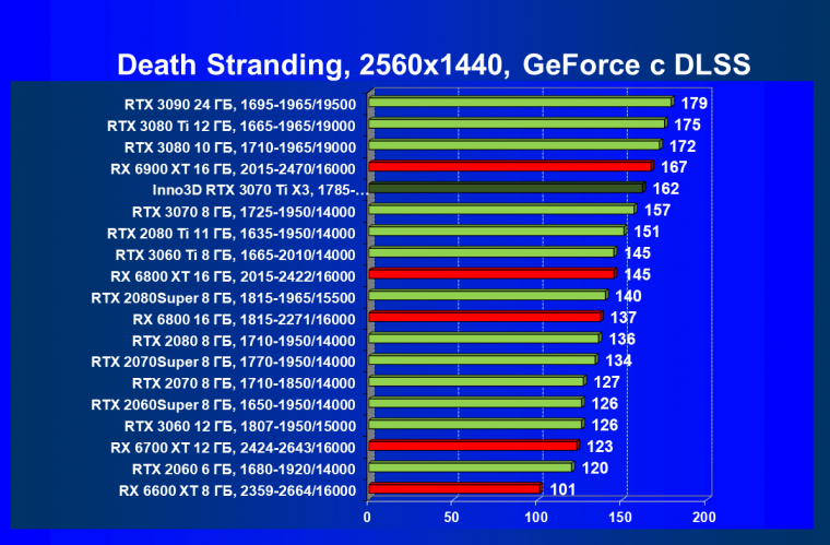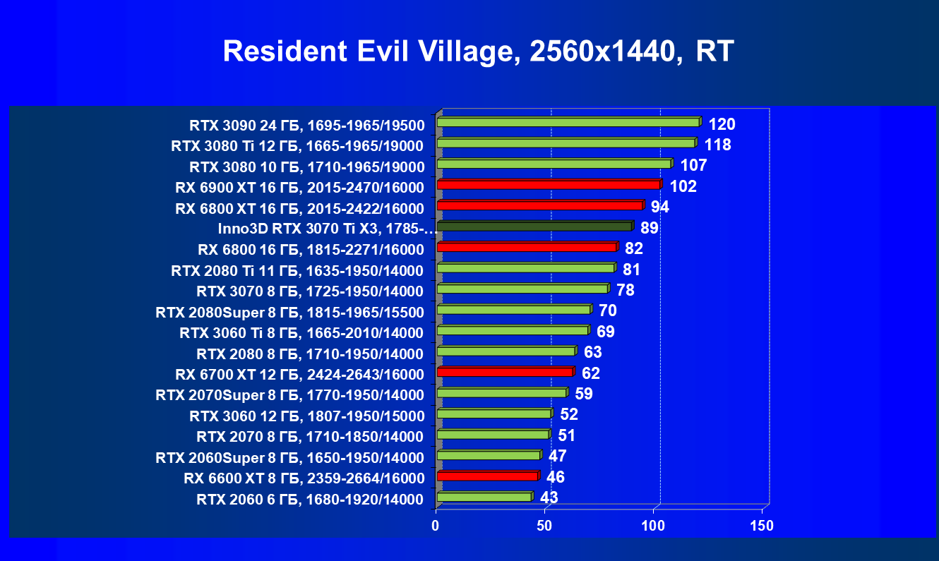 Наши тесты показали, что GeForce RTX 3070 Ti отлично подходит в «классических» играх без использования трассировки лучей в разрешении 4К при условии максимального качества графики, то же самое справедливо и для игр с использованием трассировки лучей при задействовании умного антиалиасинга DLSS, а остальные игры с RT (но без DLSS) будут играбельны в 2.5K при максимальном качестве графики. Ближайший конкурент — Radeon RX 6800. Видеокарта Inno3D в этом плане почти полностью аналогична референс-карте (условный фабричный разгон мало чего дает в реальности).