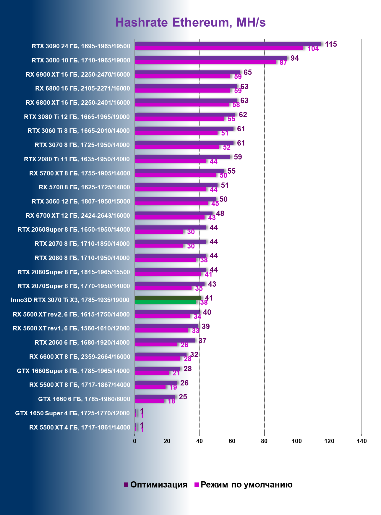 | 07 | Inno3D RTX 3070 Ti X3, 1785—1935/19000 | 450 | 44 | 103 000 |