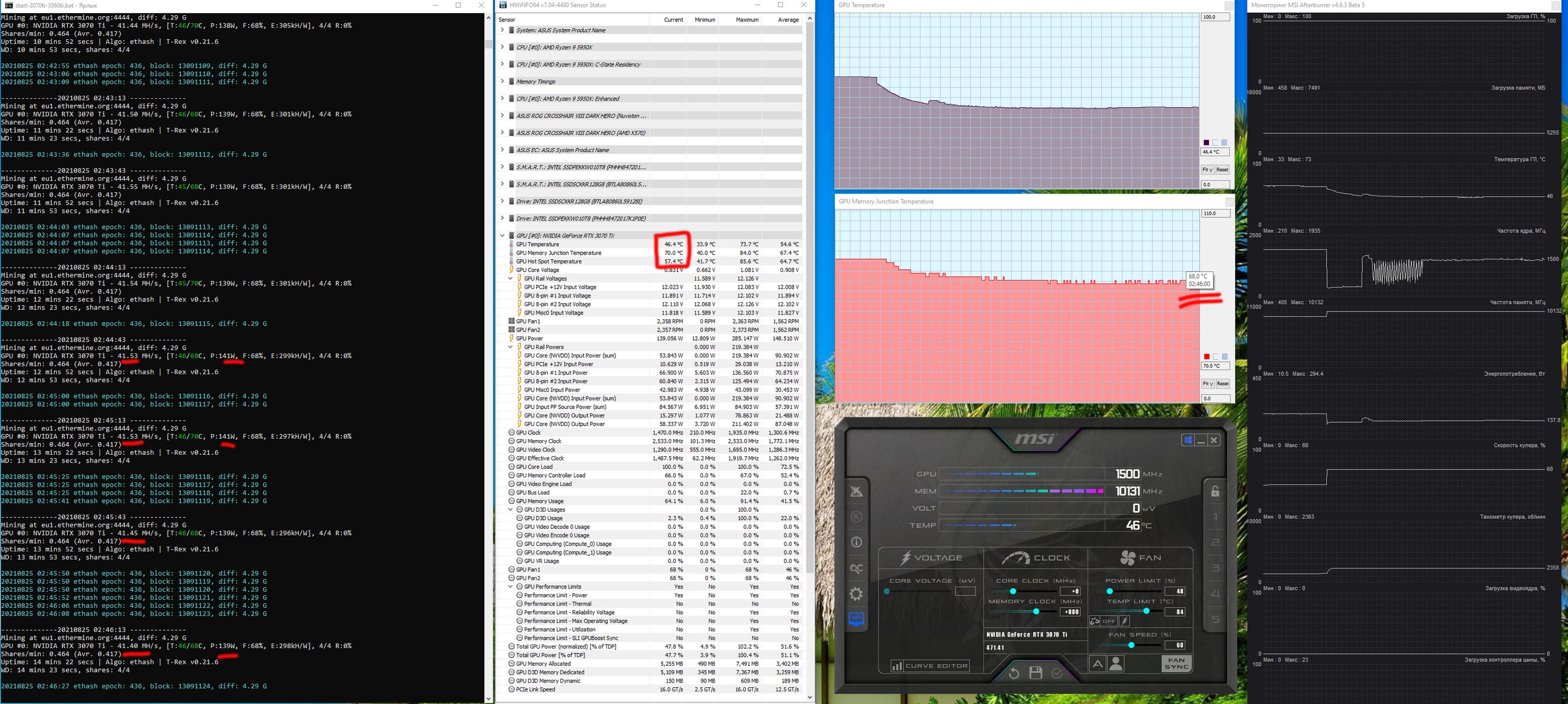 Оптимизация настроек работы видеокарт под майнинг в нашем случае не предусматривает сильного разгона видеопамяти, также обязательным является внешний обдув видеокарт. Особо тщательно надо следить за нагревом GDDR6X у GeForce RTX 3070Ti/3080/3080Ti/3090, ибо максимум для этой памяти — 110 градусов, и она долго не проживет, постоянно работая в условиях нагрева выше 100 °C. В нашем случае после оптимизации параметров работы карты и принудительного улучшения охлаждения нагрев памяти в майнинге по алгоритму ethash резко снизился до 68-70 градусов, так что в плане температурных показателей карта вполне годна для таких целей. Но все же не забываем, что выдает она низкий хэшрейт — около 41 МХ/с, потребляя при этом весьма много — 141 Вт.
