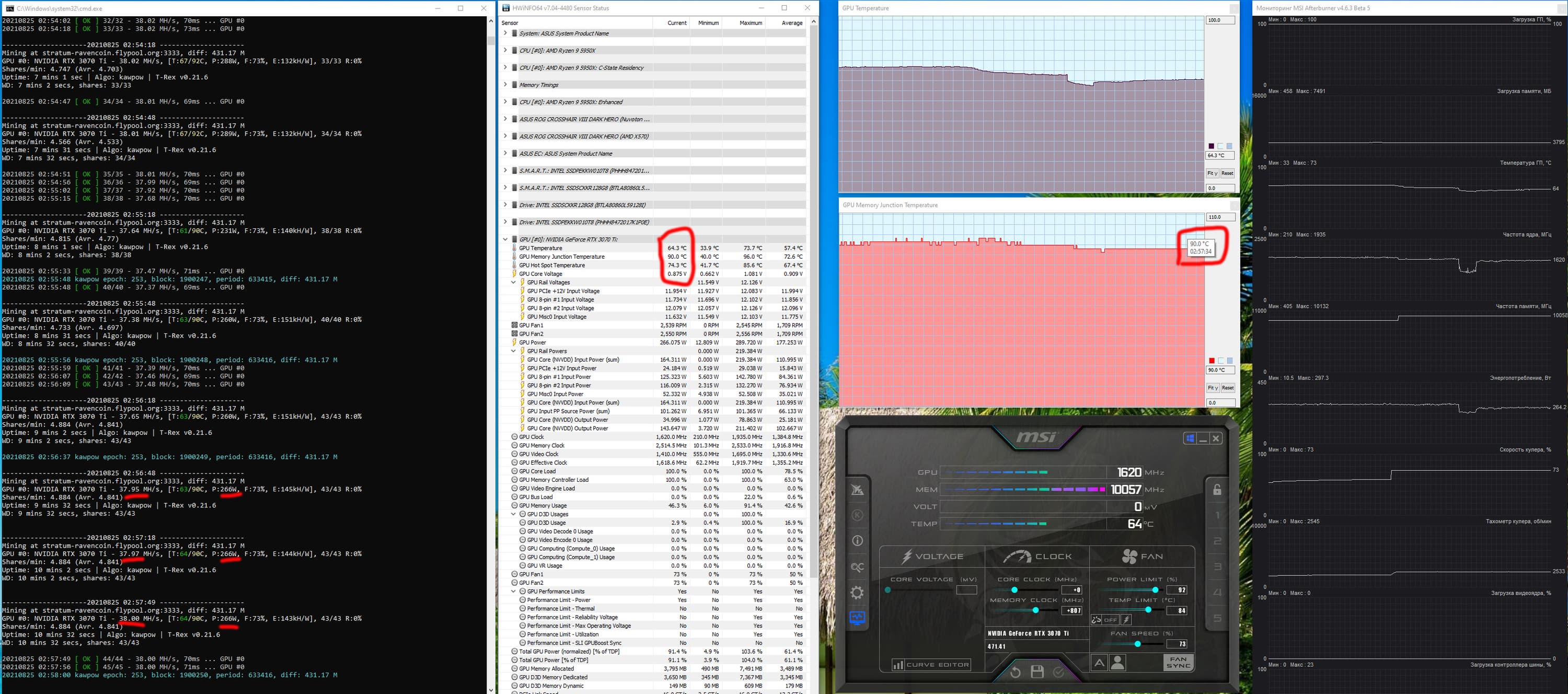 Оптимизация алгоритма kawpow (RVN) здесь мало чего дает, ибо сильное понижение PL приводит к падению хэшрейта (а в случае с ethash сильно спасало именно снижение PL, ибо хэшрейт оставался таким же при гораздо меньшем потреблении). Нагрев памяти чуть упал, делая данный вид майнинга приемлемым, но выгодно ли получать 38 МХ/с при потреблении 266 Вт — пользователь решит сам.