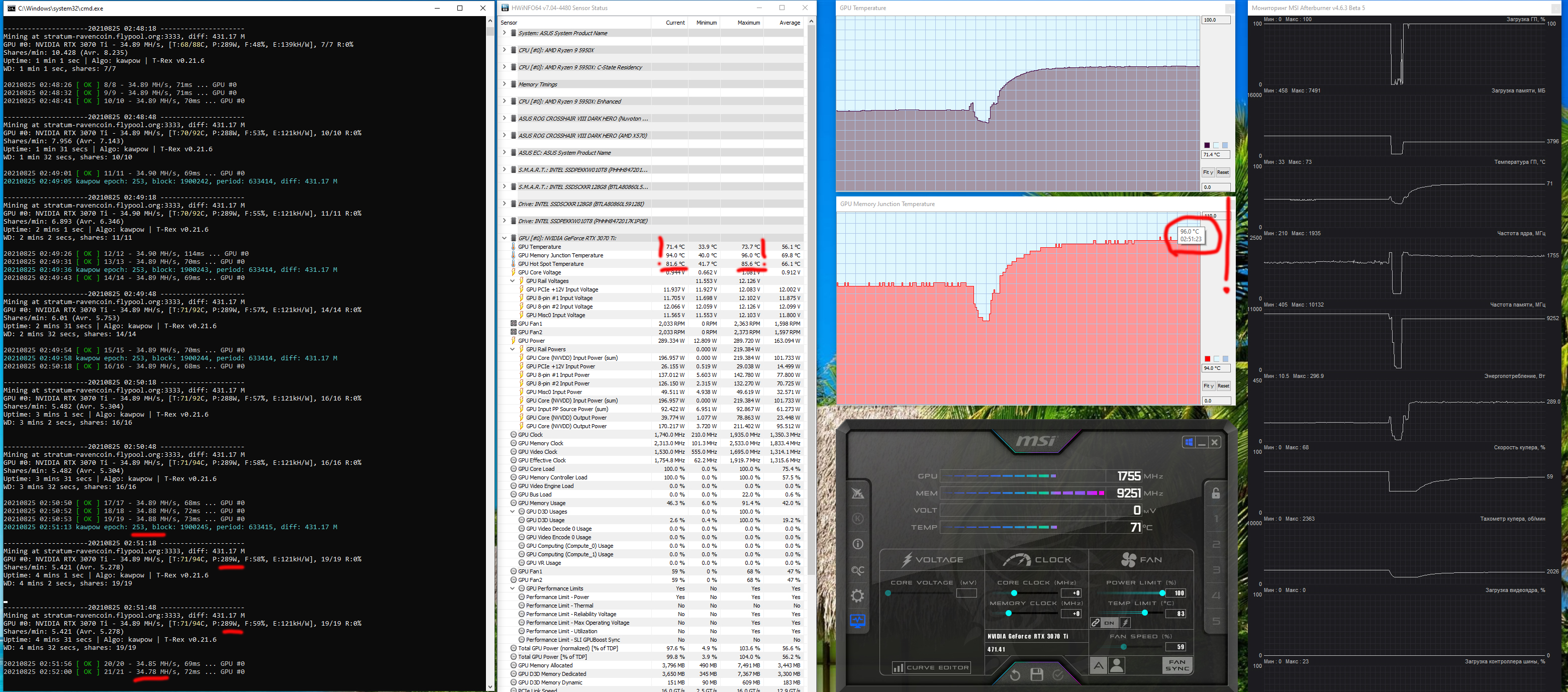 А вот хэшрейт по RVN ожидаемый (пропорциональный теоретическим возможностям ускорителя), так что в данном случае защита от майнинга не работает (также проверялось на альткойне ERGO). Соответственно, «защищена» карта, только пока основным алгоритмом майнинга остается ethash. Следует особо отметить, что алгоритм kawpow запрашивает более высокого энергопотребления, чем ethash. Поэтому нагрев выше, чем в предыдущем случае. 3070 Ti в майнинге RVN показал хэшрейт между RX 6900 XT и RTX 3080. Но! Нагрев памяти карты сразу же при запуске майнинга достиг 96 градусов, что является уже некоторым тревожным сигналом. Впрочем, не забываем, что это запуск по умолчанию.