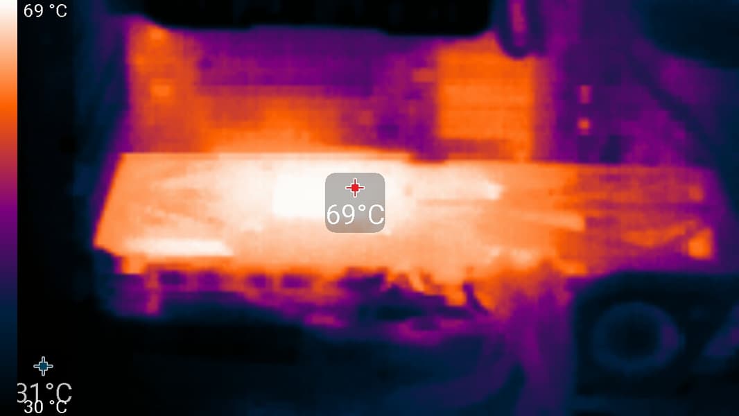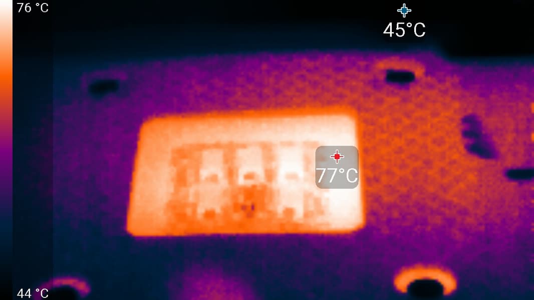 Максимальный нагрев наблюдался в центральной части PCB, в основном около ядра (и основным источником нагрева является память). Но также стоит обратить внимание на разъемы питания: они нагреваются очень сильно, особенно тот, что ближе к центру платы.