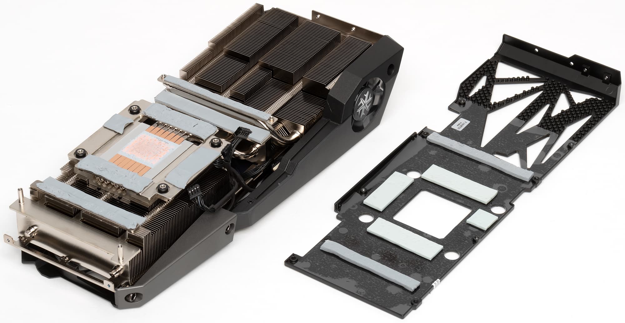 Собственно, и эталонный дизайн для партнеров был разработан по тому же принципу. Перед нами большой пластинчатый никелированный радиатор с тепловыми трубками, формирующими подошву прямого контакта с GPU. Микросхемы памяти охлаждаются пластиной вокруг основной подошвы радиатора, а преобразователи питания VRM охлаждаются с помощью отдельных пластин, прикрученных к тому же радиатору. Задняя пластина не только служит элементом защиты PCB, но и участвует в охлаждении оборотной стороны платы через термоинтерфейс.