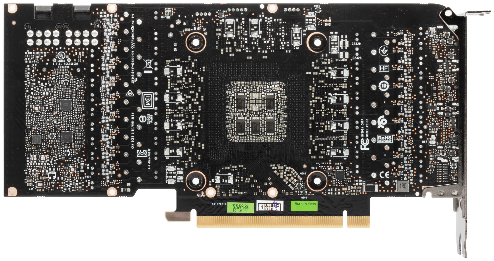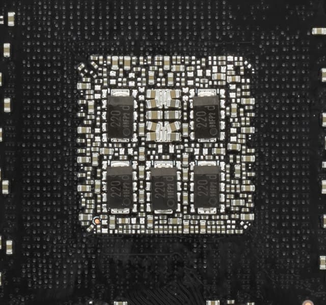 Надо снова поднять тему про нашумевшие вылеты в играх и якобы виноватые в этом тантал-полимерные конденсаторы (черного цвета) на тыльной стороне PCB в районе GPU. В интернете разошлась информация, что они якобы дешевле, чем Multilayer Ceramic Chip Capacitor (групповые керамические чипы), поэтому последних мало, а первых много. И в данном случае мы видим, что группа MLCC всего одна. Но при этом за все время тестирования никаких вылетов из игр не было, а гонял я плату весьма долго. Все же, мне кажется, вопрос не в конденсаторах, а в конкретных экземплярах GPU, которые не выдерживают кратковременный подъем частоты выше 2 ГГц. Да и то, что MLCC дороже, является спорным утверждением.