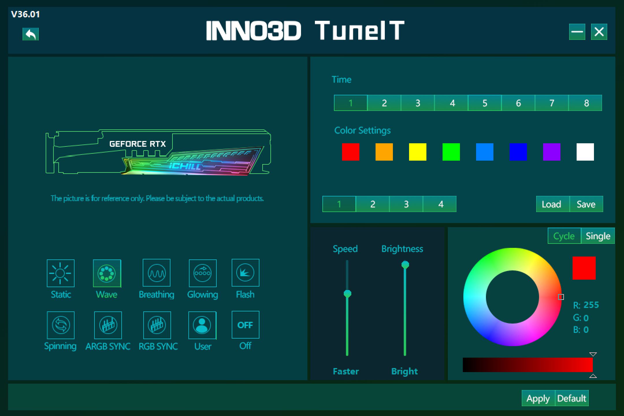 Выбор режимов скромный, однако этот вариант решения Inno3D предлагает возможность подключить подсветку (с помощью комплектных проводов) к соответствующим разъемам ARGB/RGB на материнской плате, поэтому можно синхронизировать работу подсветки. Видеоролик ниже демонстрирует подключение.