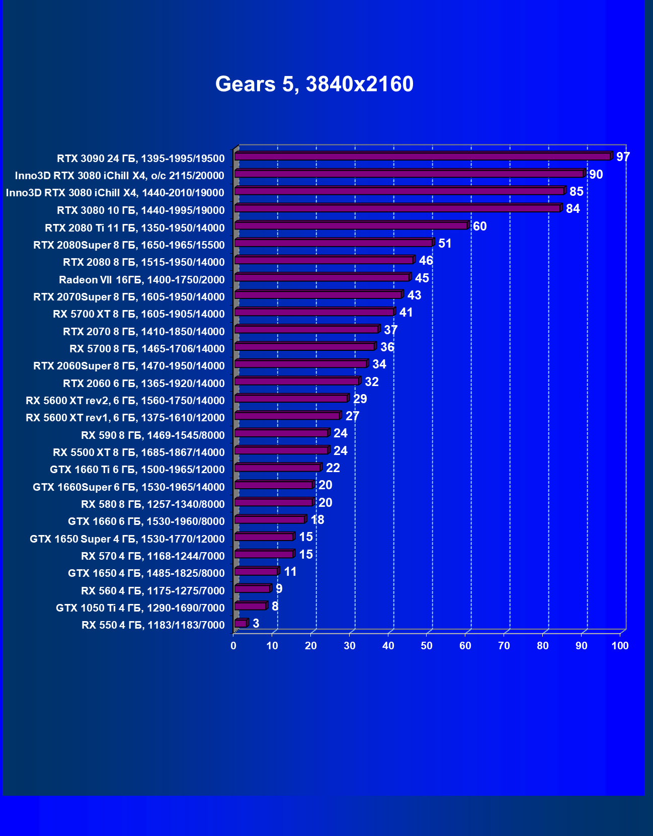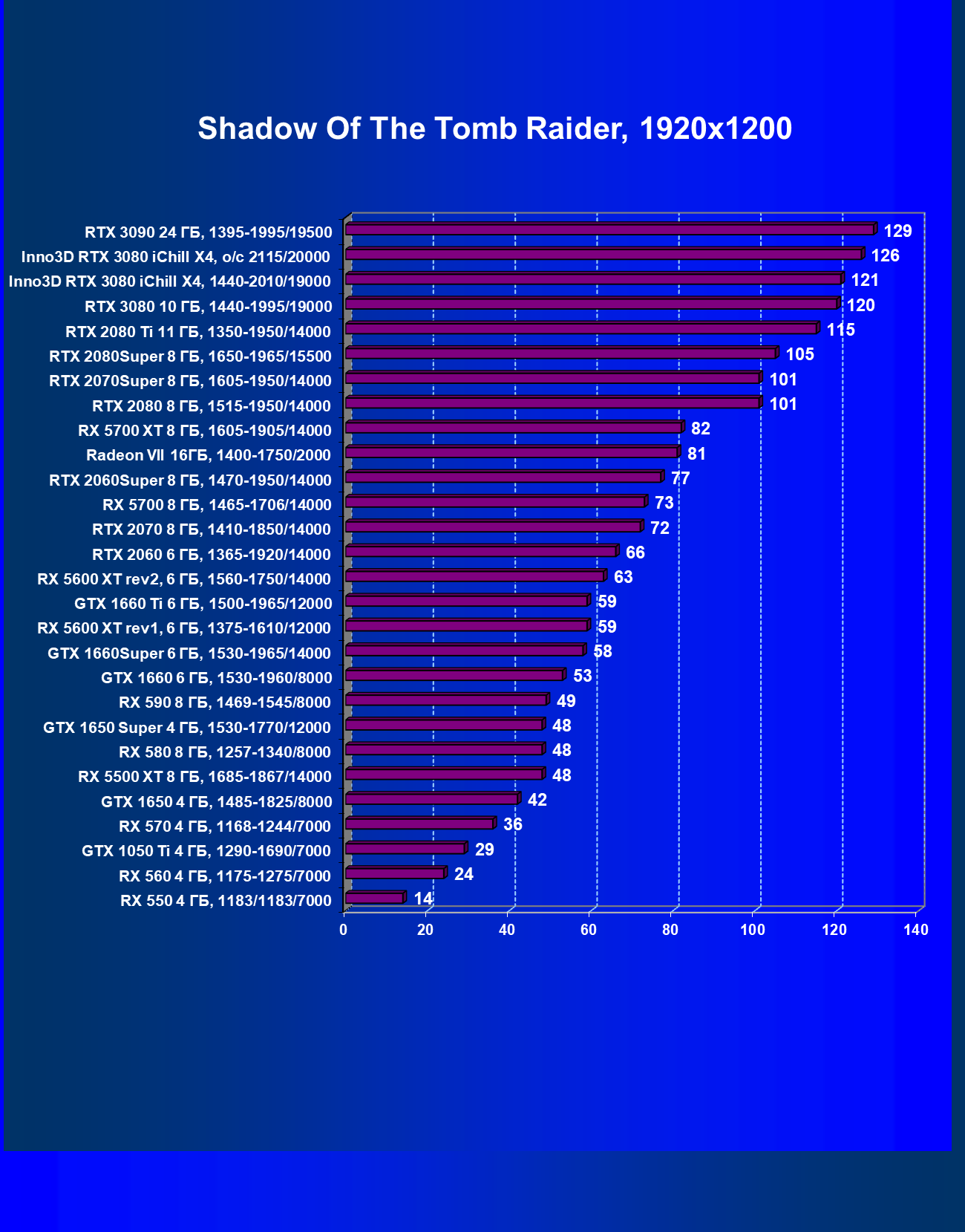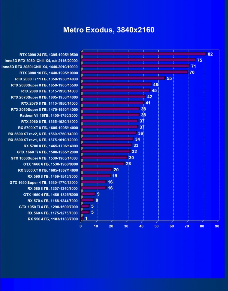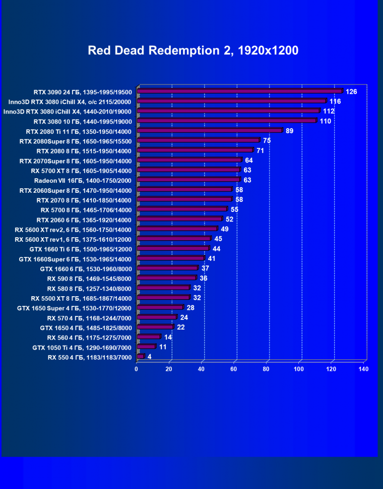 | 05 | RX 5700 XT 8 ГБ, 1605—1905/14000 | 527 | 1846 | 35 000 |