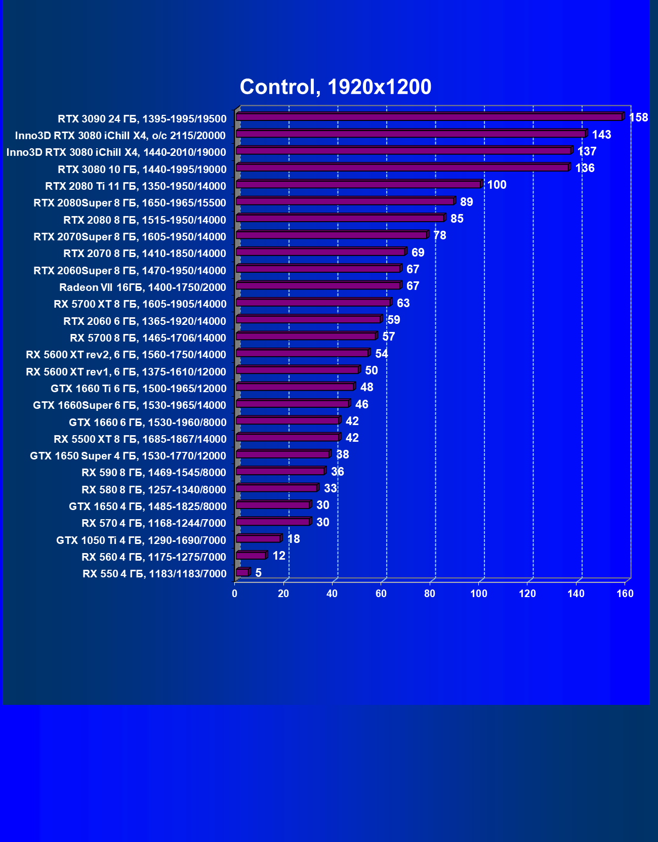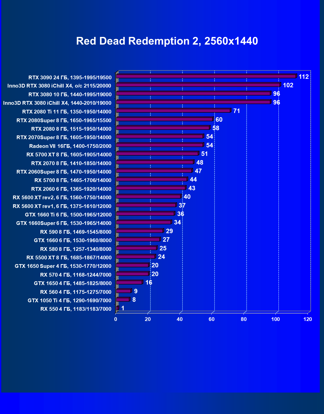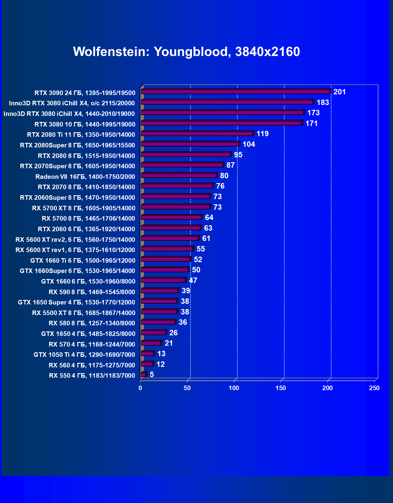 | 05 | RX 5700 XT 8 ГБ, 1605—1905/14000 | 527 | 1846 | 35 000 |