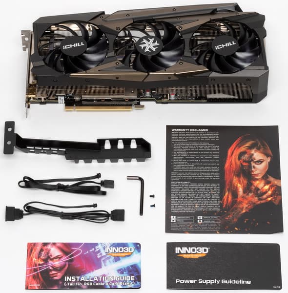 Комплект поставки, кроме традиционного руководства пользователя, включает металлический кронштейн-подставку под карту, ключ для демонтажа вентиляторов без снятия СО с карты, а также провода для подключения подсветки карты к материнской плате.