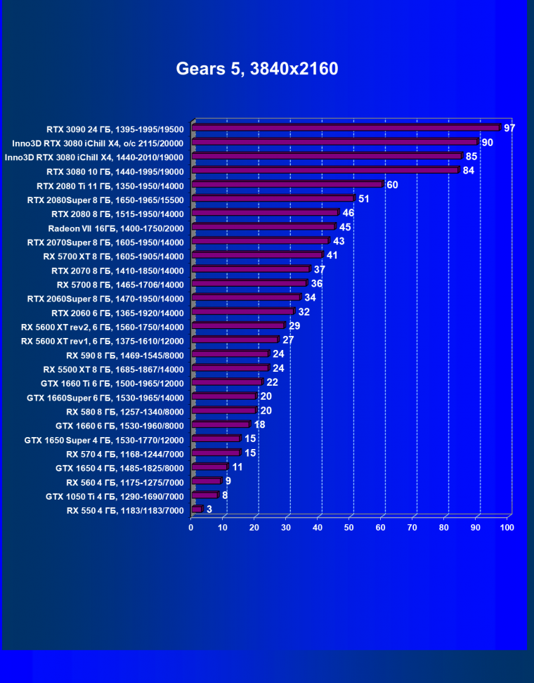 Рейтинг ускорителей iXBT.com демонстрирует нам функциональность видеокарт друг относительно друга и нормирован по самому слабому ускорителю — Radeon RX 550 (то есть сочетание скорости и функций Radeon RX 550 приняты за 100%). Рейтинги ведутся по 28 ежемесячно исследуемым нами акселераторам в рамках проекта Лучшая видеокарта месяца. В данном случае из общего списка выбрана группа карт для анализа, в которую входят GeForce RTX 3080 и его конкуренты.