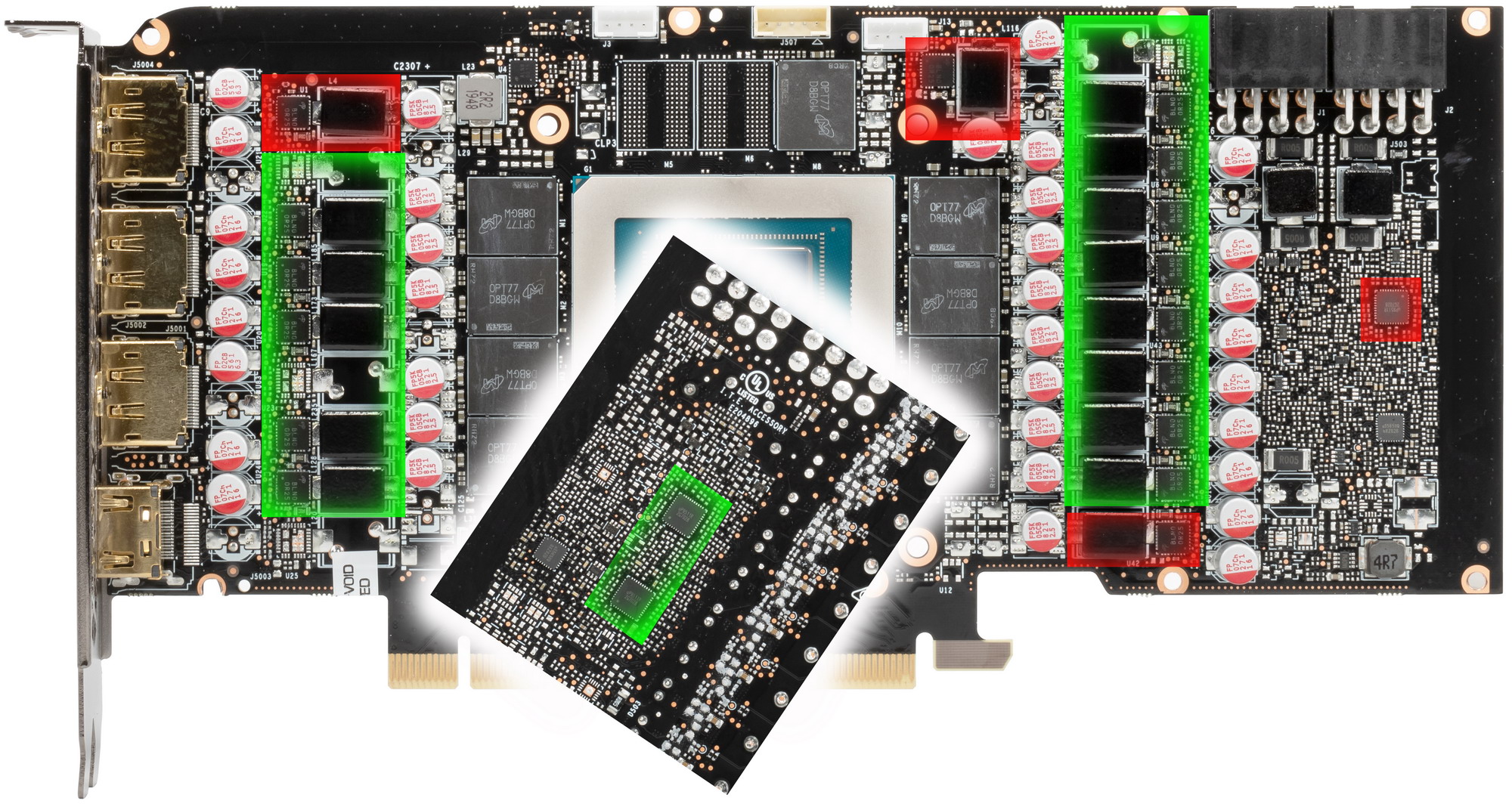 Зеленым цветом отмечена схема питания ядра, красным — памяти. При этом никаких удвоителей (даблеров) фаз нет, для управления схемой питания GPU используются два ШИМ-контроллера uP9512R (uPI Semiconductor), каждый из которых способен управлять 8 фазами максимум. Оба расположены на оборотной стороне платы.